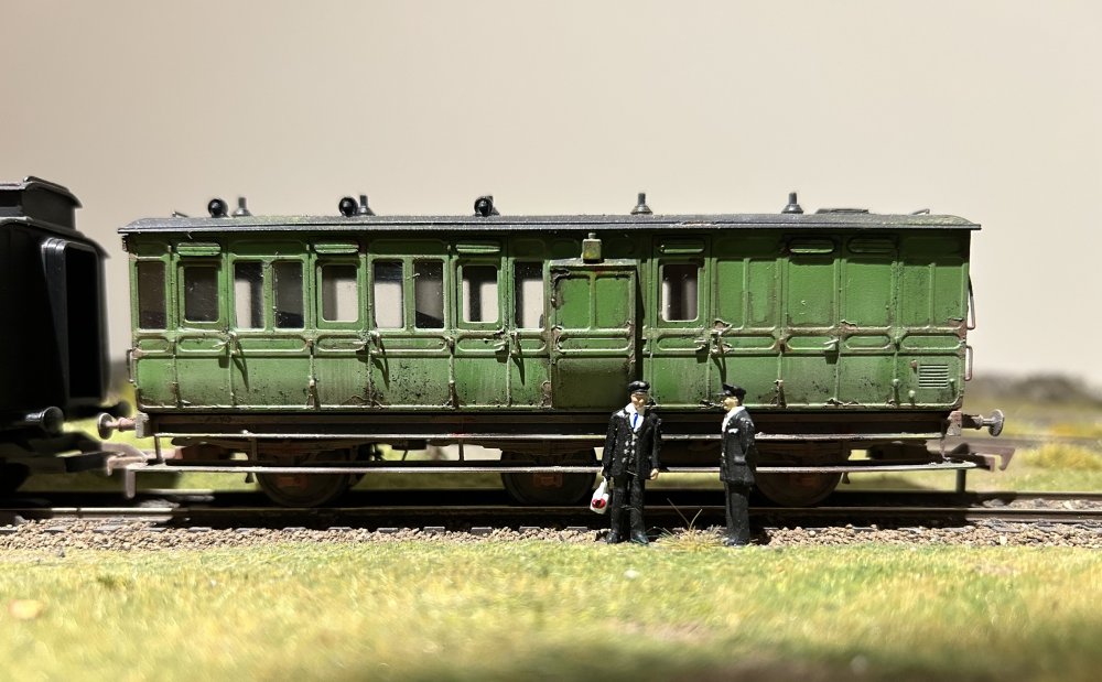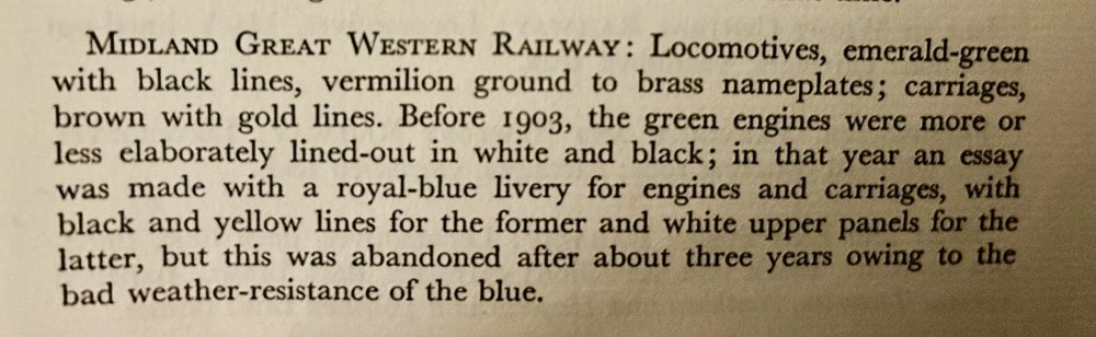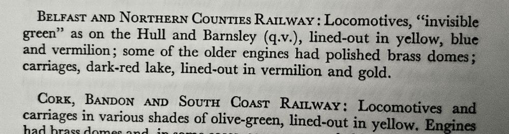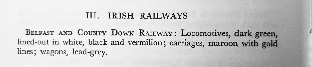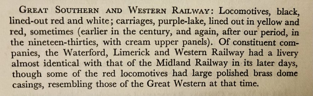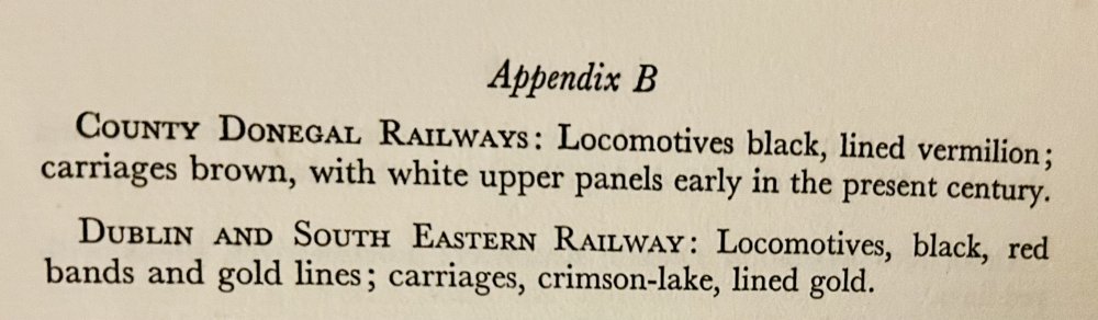 If it’s of any help, livery details for CBPR carriages were - mud grey roofs, black chassis, dark green sides, probably with yellow lining but lining colour not reliably documented anywhere I’m aware of. Ends almost certainly green too. From looking at pigments, I believe the green was probably something like what British Railways had onnsteam engines in the 1950s. Locos were black, with red lining. On takeover by the GSR, the four locos were painted grey pretty quickly, and the carriages painted in full GSR maroon livery. Even many of the station signs were quickly replaced by standard GSR bilingual enamels. On the subject of GSR coach B livery, while the standard was black coach ends, I’ve found quite a few instances of the dnds being maroon as well, often on narrow gauge types. With several Passage coaches having observation ends, I wouldn’t be surprised if all stock on that line was like that.