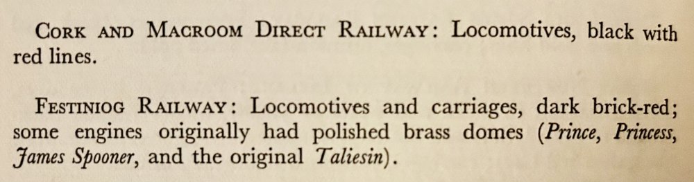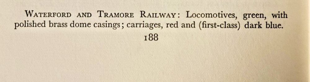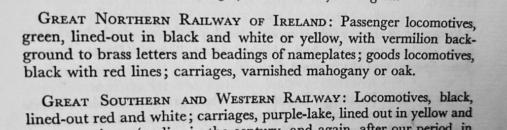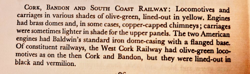 I wouldn’t. There were only a few shades and like the Southern of England, and pre- and post-1955 CIE coaches, varying shades were due to either an official livery change or weathering. The jury is out on any exact shade in West Cork, but whatever it was, it would have looked quite dark, as photos hint at, due to the copious layers of varnish that any paintwork had over it. I often wonder if their two American tank engines were actually black…. As for Macroom, I think Senior might have told me at one stage that their carriages were originally varnished, but later dark red.