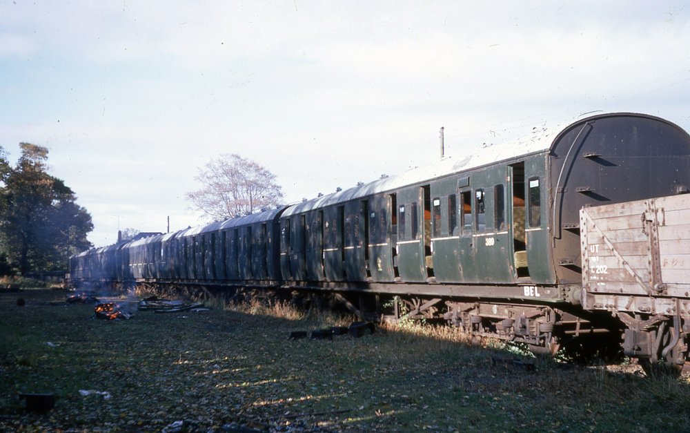 Derelict at Antrim, late 1960s. Aluminium-repannelled 1920s non-corridor NCC suburban stock, withdrawn mid-60s. Incidentally, note the size of the UTA crest. The bought transfers that are available of both the original 1949-61 "roundel" with the red hand, and the later crest as seen here, are both weel over scale size. I must measure the actual ones some time as I have copies somewhere.... maybe someone can print scale sized ones! (H C A Beaumont collection)