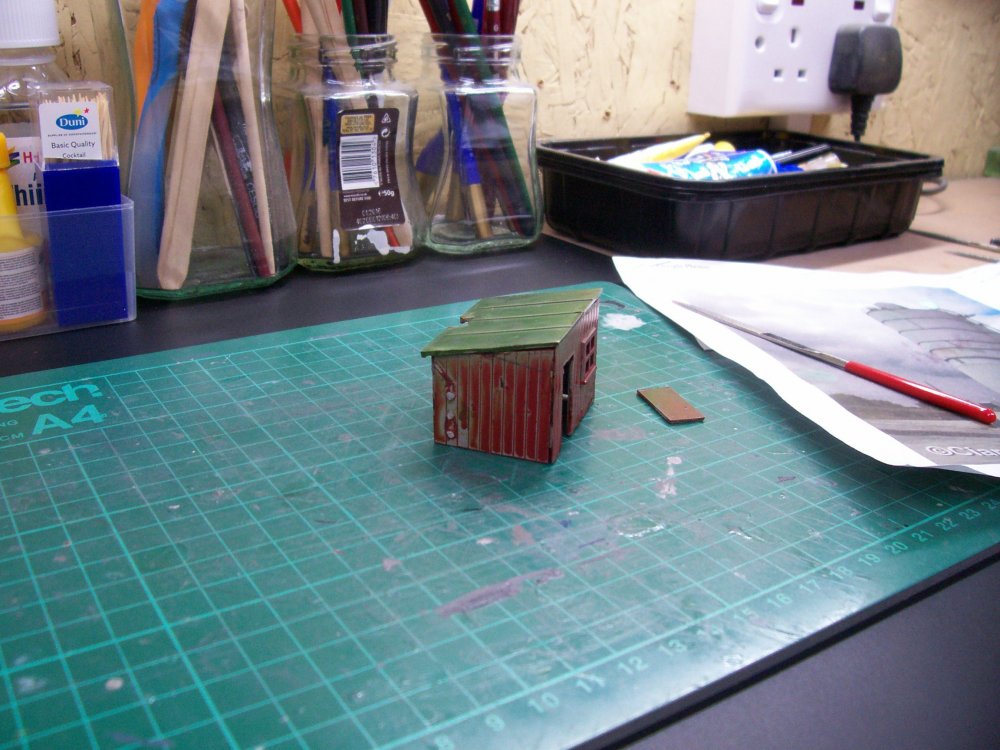 This afternoon was spent measuring and cutting out each section for what will eventually form the small corrugated structure that sits on top of the silo. To help keep everything straight I've used an old platelayers hut which I will glue the four sides to. But that's a job for another day.