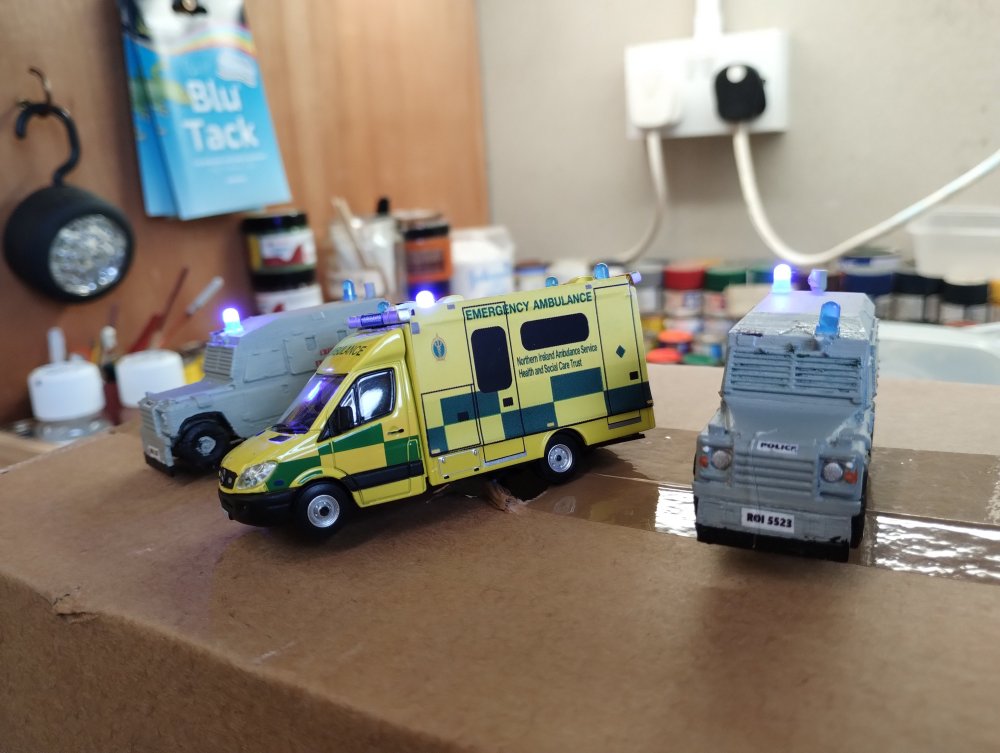 Hi everyone one NI ambulance and two RUC landrovers fitted with blue flashing lights, almost ready to fit on the layout by the pub fight scene VID_20240822_154104816.mp4 VID_20240822_154143792.mp4 -