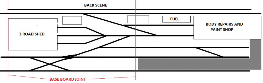 LISNEAL ROAD A new layout in 4mm scale on three base boards each measuring 4ft long and 1ft 8ins wide having a double track approach from fiddle yard to platforms 1 & 2 with sidings into a loco depot having a 3 road maintenance shed, a two road shed for body repairs and painting, fuelling point and wash area and stabling point, The third board not shown is the storage roads.TDR
