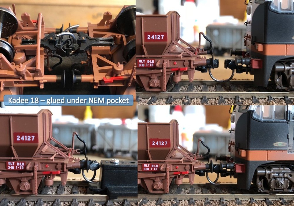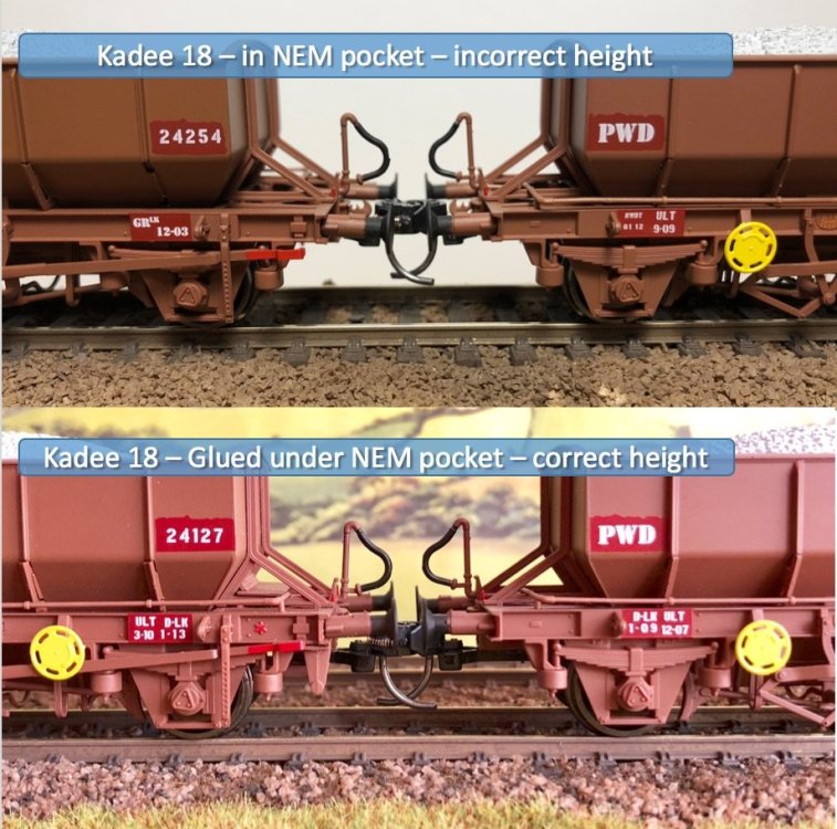 [quote=glenderg]There was no issue with coupling height, it was all done to NEM standards, and if not, this rake would have ruined itself when the video was taken on the 16th November 2017, some 8 years ago..[/quote] Hi Richie. Respectfully there was an error with the coupling height on the ballast wagons and the cement bubbles (inc ploughs that shared a common chassis). IRM even had a fix page on their web site back then with a solution. It wasn’t about running problems, it was about NEM compliance and incompatibility with Kadee couplings. It wasn’t a problem if one used the supplied gull wing mini tension lock couplings but was incorrect for Kadee’s as the NEM pocket height was incorrect. All other IRM stock since then had had perfect NEM pockets in terms of height from the rail top. I got around the problem by gluing kadee no 18s to the underside of the NEM pockets to get the correct height for kadee coupling height guage and kadee uncoupling magnets. It was a right royal PITA having to do it to two rakes of ballasts and two rakes of cement bubbles. This might have been a hangover of the unfortunate DJ input to IRMs first product which were the ballasts. Murphy Models had a similar fault with their craven coaching stock when the NEM pockets were also at the wrong height and needed fettling to use with popular kadee couplings. First world problem, but given the re-runs it might have been an opportunity to correct the tooling as that chassis is shared by carious IRM wagons (ballasts, cement, plough vans, magnesite’s, gypsum, etc). Photo below illustrated the problem. The manual fix. A pity the couplings could not be use correctly when plugged into the NEM pockets