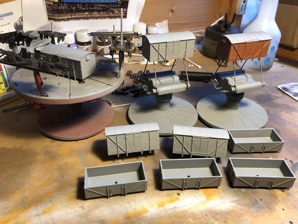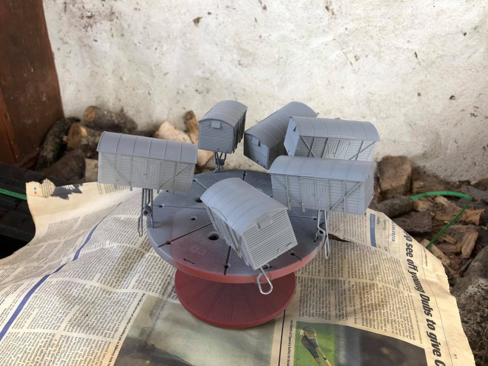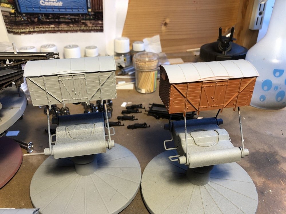 Been a while, confined to barracks so may get some mini-projects done. 6 CIE Vans started. Dapol donors primed. A little fiddling with the chassis needed. But hopefully will have 6 more vans to add to the existing 1960s rakes of pick up goods wagons. Not sure if I will do them CIE grey or CIE brown or a mix (3 of each). These could go nicely with my 3D corrugated open wagons behind black'n'tan 141s.
