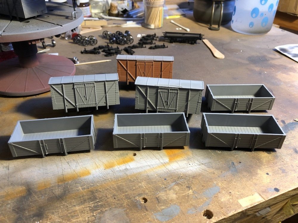 A little more progress today. A CV-19 free afternoon at the bench working on 6 CIE Vans + 4 CIE 5 plank open wagons of the flying snail era. These will be hauled by CIE era black'n'tan white stripe locos such as 141, or A class, or perhaps even a 121. Two axle goods trains are my favourite because of the operational shunting variety and interesting ops. Never a uniform rake, one or two wagons dropped off or picked up at passing stations. Dapol donors. Rail match acrylic paints. Hopefully with spare time on my hands these will be finished at the weekend.