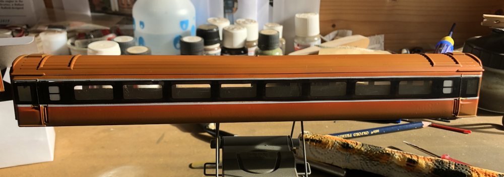 Pleasantly surprised the Hornby Shortie donors (ie only 7 windows) were resprayable as the windows are a single stip of transparent plastic painted black leaving the windows clear (ie the windows are not separate pieces), so it almost unmask able practically, but the Hornby shorties donors I used were BR swallow livery which fortunately have a black band on the window strip, so easy, just pop the whole strip out, paint, and refit.