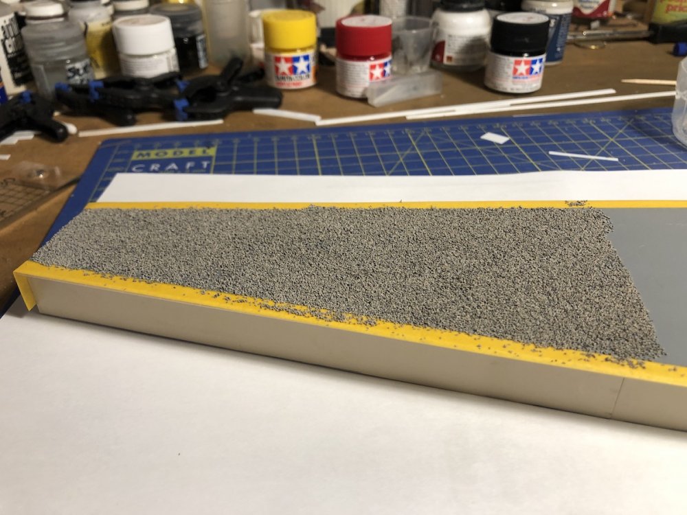 Doing some trials on rejected platform sections trying out different surfaces. Gort had a sort of aggregate chipping for a surface (1 inch down). Will judge in the morning after the PVA has dried overnight.