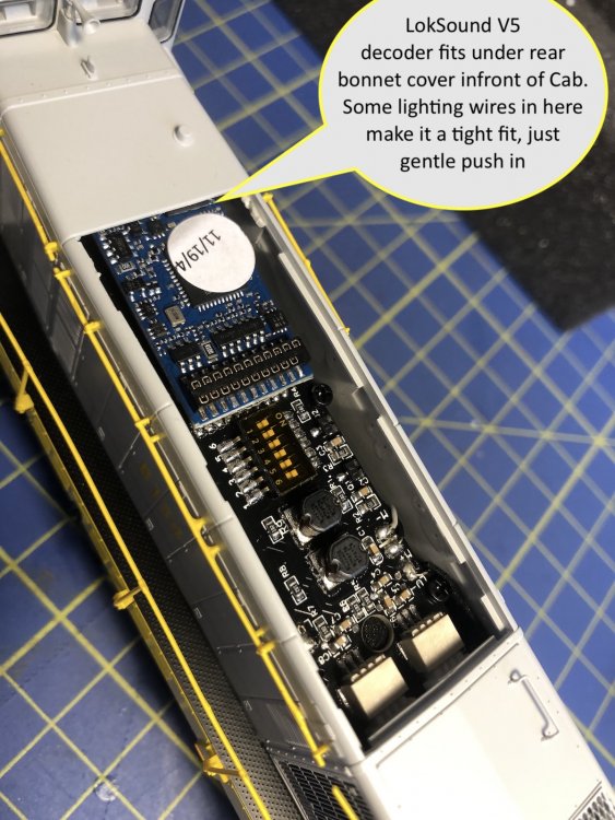 How to fit DCC decoder into MM 121 model loco 1. Access panel easily lifts off top of body 2. Plenty of space. Decoder fits under body panel in front of cab windows. Carefully remove the blanking plate - do not bend pins 3. Lighting wires under body top make it a tight fit, but gently push decoder in and it will get past the wires. LokSound V5 21 pin decoder 4. Lenz Silver+ non-sound decoder fits snugly and drives this loco very well. Cost €25 from Germany (eg Modelbahnshop lippe or Keiskemper)