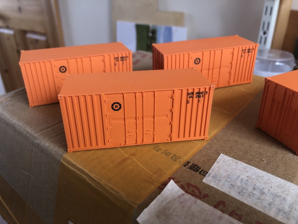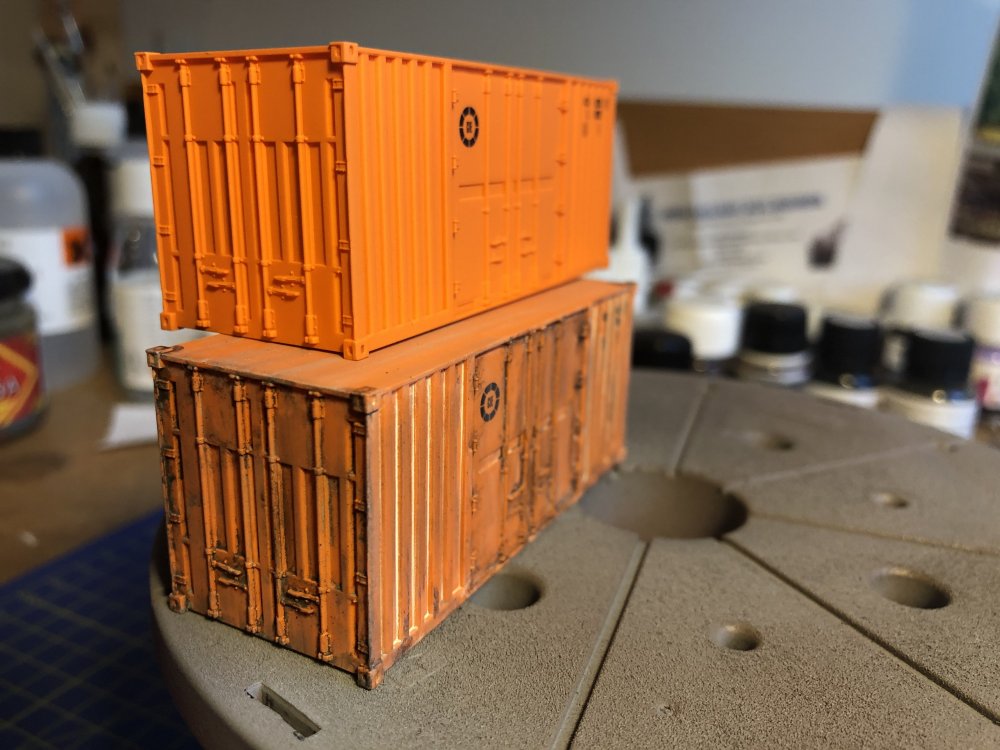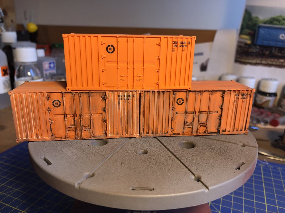 Reasonably content the way these got a little aged and dirty Next up during the week will be to have a go at these CIE containers. Just sprayed them with matt varnish which has taken the bright shine off them in prep for weathering next week.