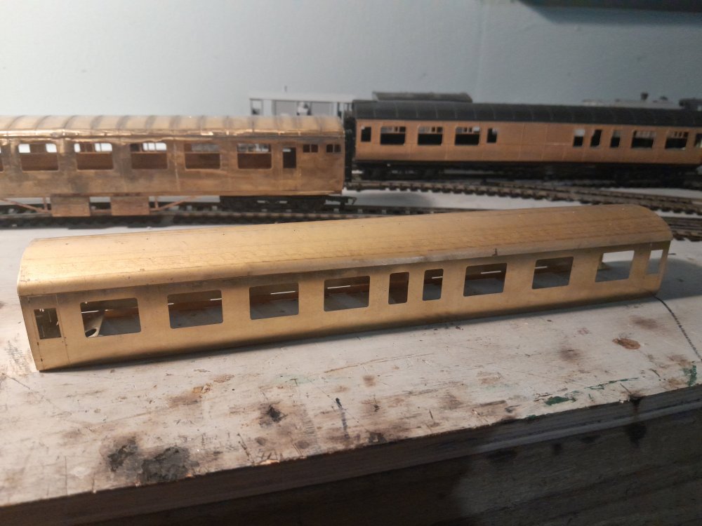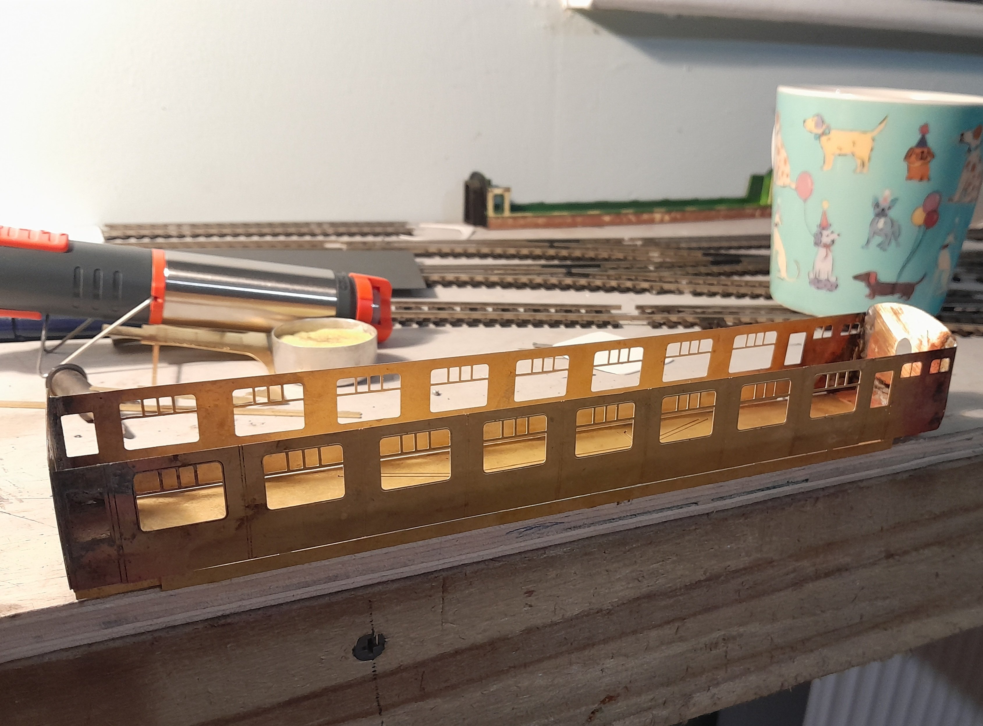 Some more work done recently. Acquired a Worsley laminate SO kit. Have another two laminates ordered from Worsley Works, getting orders in before Allen retires! On some dummy bogies, awaiting parts from Dart Castings. Got my order from JM today also. After finding the roof and glueing it onto the dapol body the buffet sides were scribed, tumbleform formed from a thoroughly ag spec jig, and then overlayed. Both now require detailing, roof vents and cabling, glazing, interiors, painting, the list goes on! Some dry fitting on the Bredin Steel side. And the G2 has returned, was receiving some touch ups to paint and a new drawbar. Much to do on her also, weight to be added, the tender needs it's springs and axleboxes along with a dose of weathering, more handrails, step added to cab and the cab interior needs to be built and fitted. The chassis and wheels on both loco and tender also need a repaint into grey! I've also a horsebox, meat van and 2 tin vans to build, so plenty on the workbench!