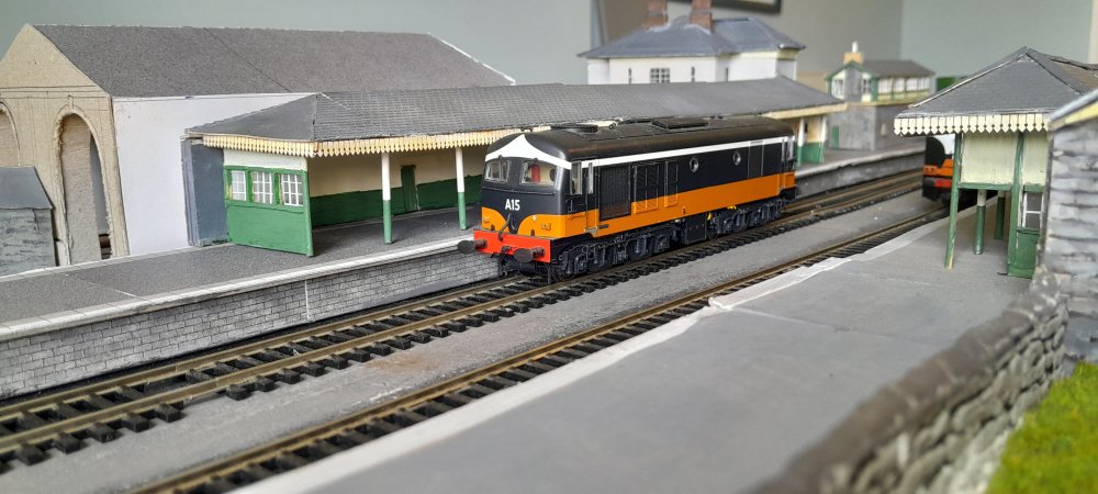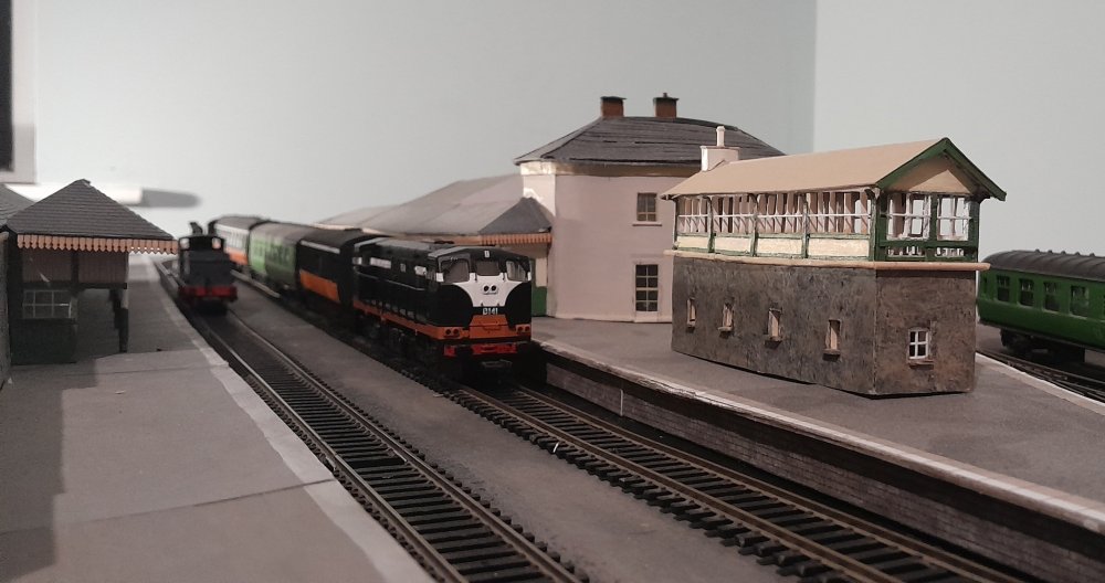 Some detailing work, upgrading, patching and painting was done this week. The ornate window frames on the station building were added. These were made from toothpicks! Quite interesting to see how far this area has come. Next up was the water tower in front of the signal box. Mullingar had three water towers at the station, plus a water crane on the island. Only the one on the Galway side is left these days, unfortunately. Both water towers are Peco, though the new one has a considerably shortened tank and stack. This was achieved with a blade run a few times along a convenient score line, then breaking it off. After this, I added some roping around the base. I cannot for the life of me remember what this is called. I knew once. At any rate, the rope is for hanging paintings steeped in tea. It looks quite overscale, but I don't mind. Interestingly it doesn't appear in the 1957 photo above but does in other photos. The other tower is similarly inconsistent. While doing this, the roof on the main station building has been replaced with a simple piece of framers card. The previous roof was strips of plastic roofing, but I wasn't happy with how it looked. I think it makes a big difference without taking away from the building. Back to the 50s and 60s... Looking much cleaner than A1, A30 is on similar goods duties in 1957 A15 is running light engine toward Dublin as a 141 slows with a passenger train from Dublin. A15 will split the train and move it to the Sligo side of the station A Plethora of Diesels at dusk! B141 is on the Galway Mail train Meadbh takes on water as she prepares to take her express onto Dublin. The PW gang are joking that they've lifted some of the track on the Sligo side to prevent her from going any further in that direction! Thanks for looking