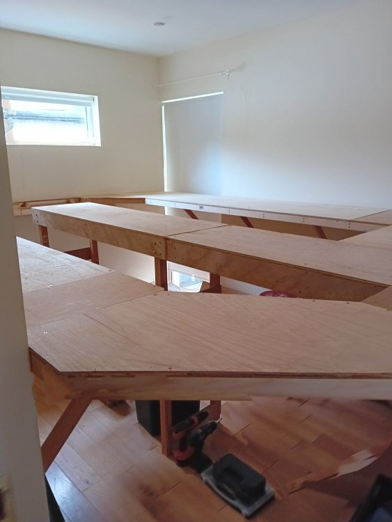 Its hard to believe that its over a year since my last post. What a year it has been. I got the layout to the stage where all the track was laid and fully operational. I did spent a lot of time running trains for the grandkids and am hopeful the the hobby might not be lost on future generations. I had a dress rehersal for a full operating session and then life intervened. The two of us were rattling around a large house that was impossible to heat, using perhaps a third of the living space so we made the momentus decision to downsize and sell the house after 32 happy years there. I had to dismantle the railway, pack it all up and put it into storage in my daughters attic. We were very lucky, we got a good price for the house and found another close by that meets our needs, a key one being space in the garden for a timber room for my model railway version 2.1. The selling and buying took six months and then after moving in in December we made the decision to completly refurbish the new house and so are currently homeless but actually are lucky to be able to stay in any of our three kids houses, the one condition being that we help look after the grandkids. While I haven't posted very often this site has been a constant in my life keeping me in touch with the hobby over the last year. I really appreciate what everyone contributes and IRM for running an add free service. I have a great team of Romanians working on the house but have assumed for myself the role of clients representative, resident engineer , assistant plumber, assistant electrian, assistant dogsbody. The result being no time for modelling. We hope to move back in around Easter. Below is a picture of the timber room that I was allowed purchase. Its nominally 16 x 12 in old money, about 15'8" a 11'8" internally, fuly lined and insulated. It is currently being used for storing our furniture so I hope to have vacent possession in a couple of months. I am currently designing version 2.1 of the layout so more to follow.