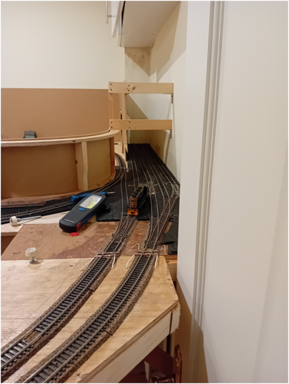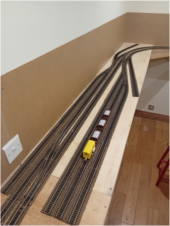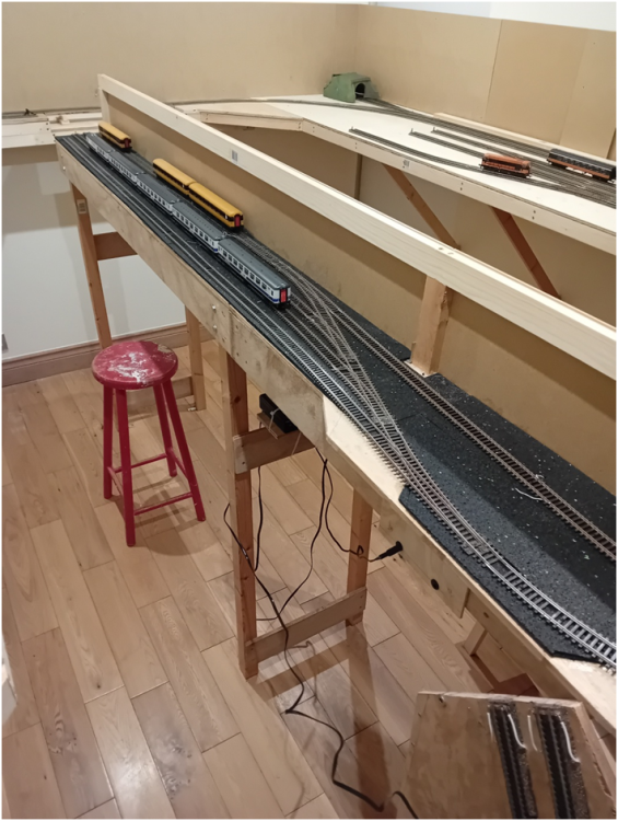 Latest update! I bought the 12mm plywood and 2 x 1 softwood in B&Q in Liffey Valley about 10 or more years ago. At the time their standard plywood was very good quality and they would also cut it accurately for customers. Their 2x1 softwood was straight with very few knots or other defects. I screwed 400mm high hardboard directly to the wall for the backscene. The upper part of this will be covered in a cloudy sky wallpaper but I am not yet sure what I will use for the lower part. I have never got this far on a layout before so scenery is going to be something new to me. The track is now laid. For the scenic part of the layout I first laid out the points and track roughly until I had the track layout finalised. I drew a centre line on the plywood and glued Midwest Products cork trackbed down using a spray adhesive. I then screwed the track to the cork using 5mm x 1.2mm screws that I sourced on line. This means that if I change anything in the short term all the track will be recoverable. I will only consider ballasting the track when I am 100% happy with the track layout and operations. In both staging yards I laid the track on two layers of a rubber packing material. Control is a Roco Multimaus DCC master and slave controller. A ring main of 2 x 1.5² solid wire runs under the whole layout. Droppers are soldered to spade connectors and up through the plywood to the rails. The spade connectors are then inserted into crimp connectors clamped to the 1.5² wire. I tested all the trackwork as I went along with my Kato GP35 which runs jewel like. Ferrybank Yard On the left is the carriage siding, double track main line in the middle, three track yard with headshunt and pallet unloading siding on the right, and oil siding in the corner. Peninsula. Showing the four track north staging yard (Dublin). The kickback siding is electrically isolated so I can use it as a programming track. Junction The main line comes around the corner through the tunnel which will be replaced by a hill and a dolomite quarry in that corner of the layout. There will be up, down and bay platforms, the bay has a run around track. I plan to put a cement silo close to where 142 is in the photograph. The track on the front right may possibly be extended over a disused turntable to a loco shed. Junction and branch The main line curves around passing a beet siding and through the backscene into North staging. The branch line also curves around passing what will be the magnesite factory into the branch station. I have a Walthers ADM grain silo kit which I will install in this area mainly as a view blocker to hide both the tight radius curve on the branch and also the main line exiting to staging. South Staging This is a four track yard behind the backsene shown in the previous photo. The double track main line comes from Ferrybank over the lift out section and into the yard. On the left is the continuous run connection, The centre track has a run around and the right hand track has a kickback siding behind the door. The lifting flap was designed so that it can be installed with the door either open or closed. Main line For the main line between the two stations I lowered the baseboard so I could install a bridge. The next stage is to unbox all my Murphy Models and IRM stock accumulated over the years, fit chips to all ten Irish locomotives, and start to play trains. I am in the process of drawing up a timetable based on the traffic flows that would have been standard back in the 1980’s when I worked in CIE. Typical passenger operations envisaged are: 3 x Dublin Waterford return trains per day – 2 sets will be needed – Mk 2 or Mk 3 or Craven / park royal gen van 3 or 4 x Wexford – Junction return – 1 or 2 may be extended to Waterford 1 set needed craven park royal gen van 1 x Friday only Down train and 1 x Sunday evening or Monday morning only up train Craven Park royal gen van 1 x NIR special – Mk 2Bs Freight Flows Up and Down Scheduled liners – sundries / containers Dublin Junction Ferrybank Waterford Fertiliser paths Dublin Junction Ferrybank Waterford Cement path Dublin Junction Oil/ magnesite train Waterford - Ferrybank - Drinagh Dolomite train Junction - Drinagh Beet pick up Drinagh Junction - Waterford- South Staging Through Trains - Dublin direction to Waterford direction Tara ore Lisheen ore (Dicky Taras’) Up and down ballast Up and down Gypsum Other freight flows will depend on models that become available in the future Traffic generators at each location: Ferrybank: Oil siding Fertilizer or pallet cement siding Container and marshalling yard Junction: Dolomite quarry sidings Pallet unloading siding with cement silo Old goods siding with shed and bank 1 spare siding (possibly Beet?) Drinagh Magnesite factory sidings for oil dolomite and magnesite Goods siding for beet loading