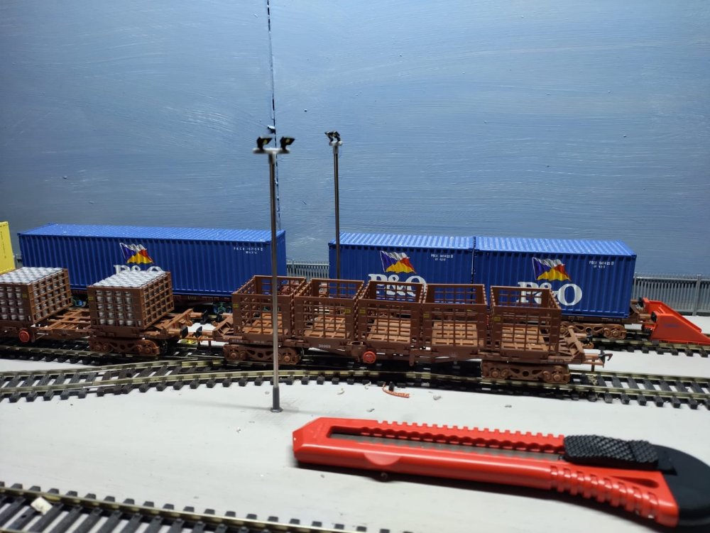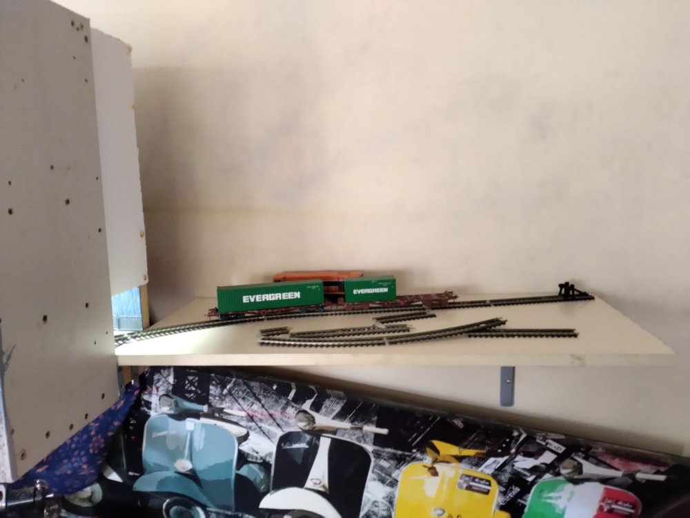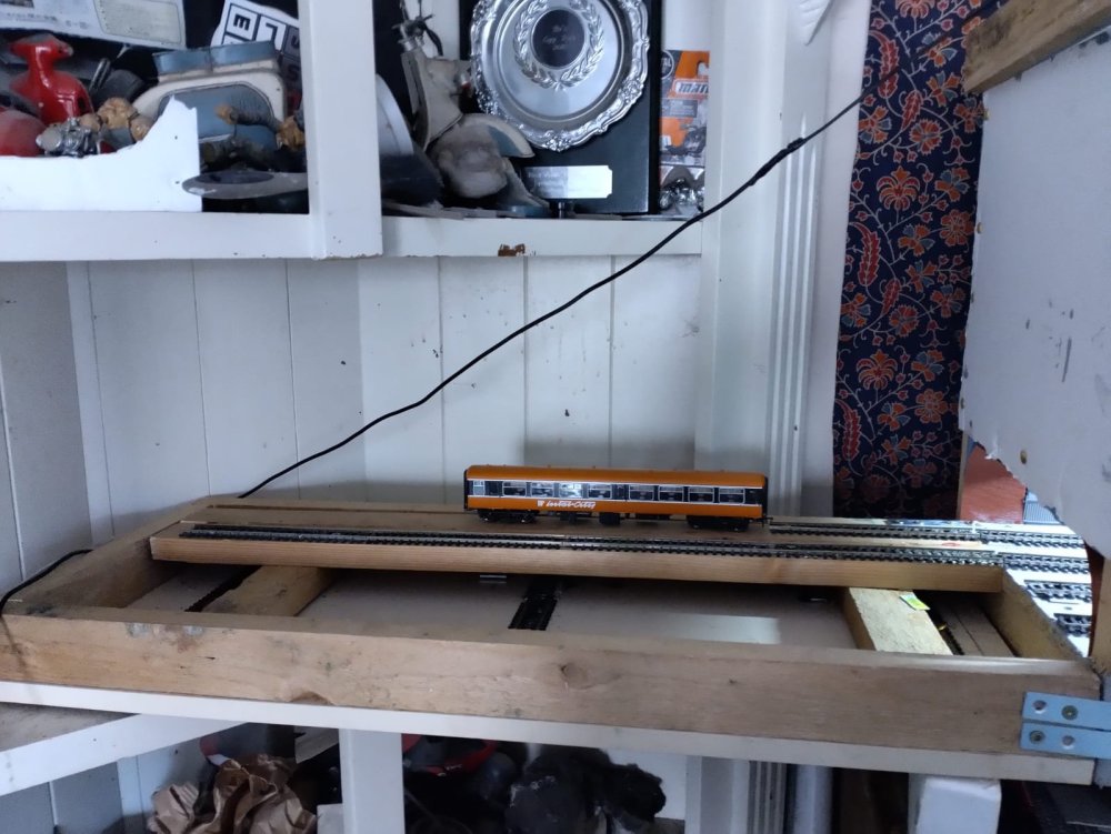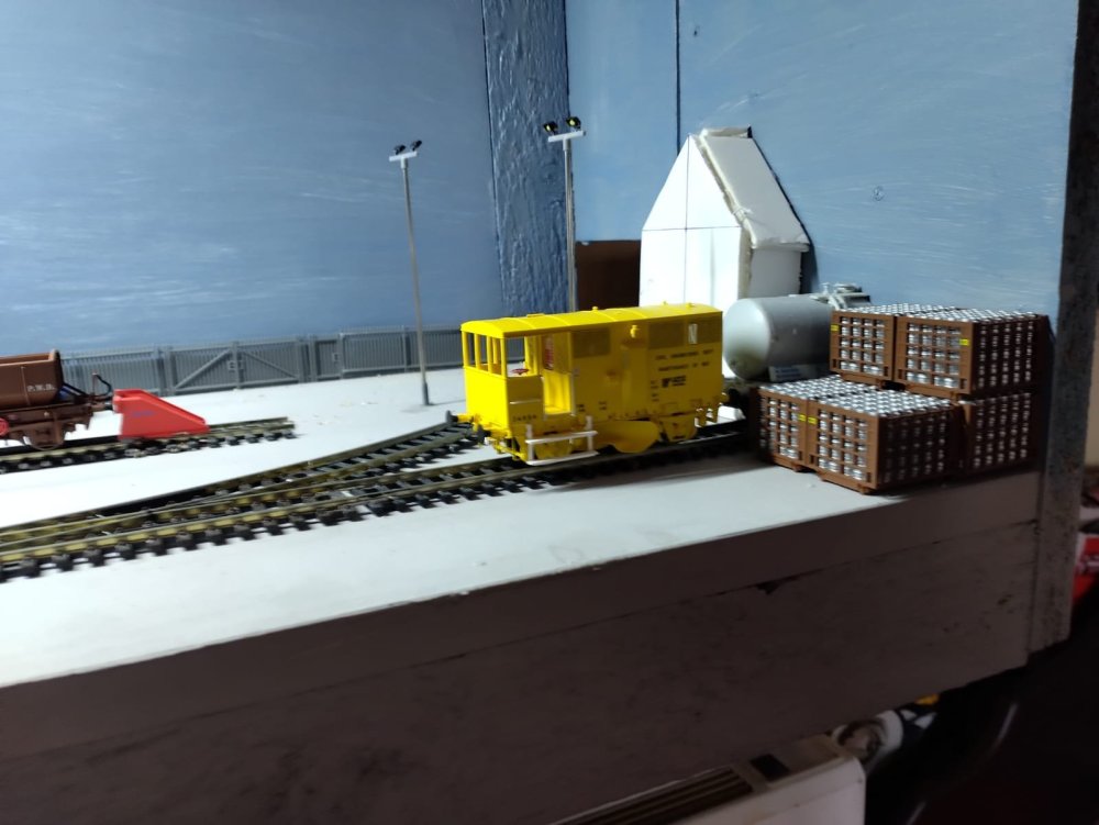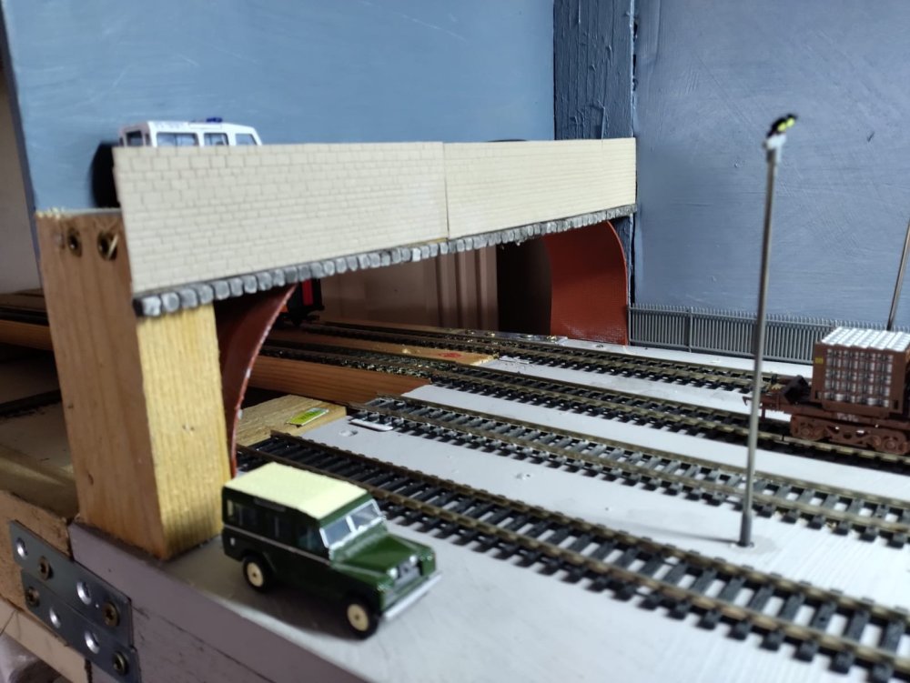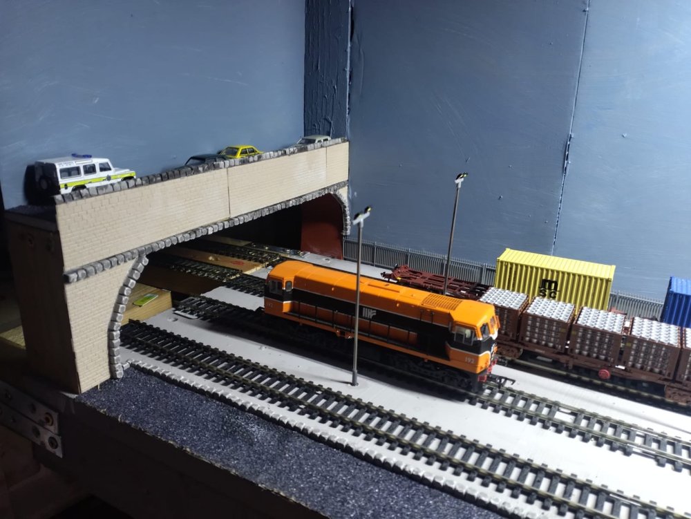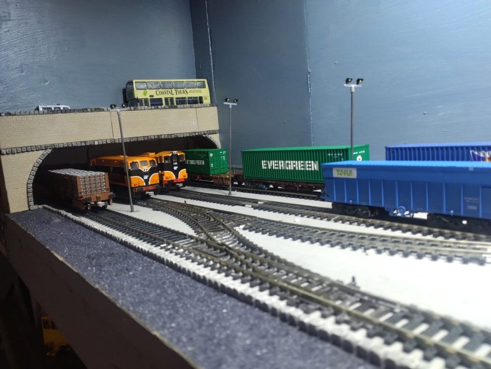 24. A reliably working traverser was paramount and whilst what i have ended up with is quite primative I am rolling flats back and forward over the transition and from line to line without a hiccup, this is literally a wooden frame with a piece of wood sliding accross it, track must be aligned manually but thats not actually much of an issue here. in time i may build a nicer looking unit with proper rollers but so far this is working a lot better than anticipated for an initial prototype. I have also erected a shelf over the other side to act as the alexandra road cassette, im actually considering making this into a longer shelf in the room that its in to give me somewhere to show off my models when not being ran but the cassette size is fixed to being the same size as the traverser over the other side ( and the whole piece of over 8 feet long now, eek) had enough palisade fencing left over from the westport build to line the entire perimeter of the backscenes, nice but i need more here and am on the lookout for suitable urban backscenes. that will suit this particular theme well. disused siding is growing, still more to do here and one thing that particularly caught my eye on multiple layouts at the wexford show was the use of mirrors on side backscenes being used in order to give the illusion that the yard keeps going on and on, I think that effect could be used particularly well in this locale and could even be enhanced further by the addition of the half wagon illusion. Another thing im working on is the road overbridge and I am attempting to do a full scratch build here using supplies obtained yesterday as there did not seem to be any sort of off the shelf bridge which would have suitably fit the space, its not being based on the real bridge or anything i just need to make myself a functional bridge to cover the space that doesnt look one million miles out of place. I think its going well! one last thing picked up yesterday were these 3v LED floodlamps. currently unsure if i will wire these up as its a daylight layout with a strong overhead light although i do imagine i will given the time! Really enjoying this one and the pace of work, couple more deliveries due for this week and atmosphere is building nicely!