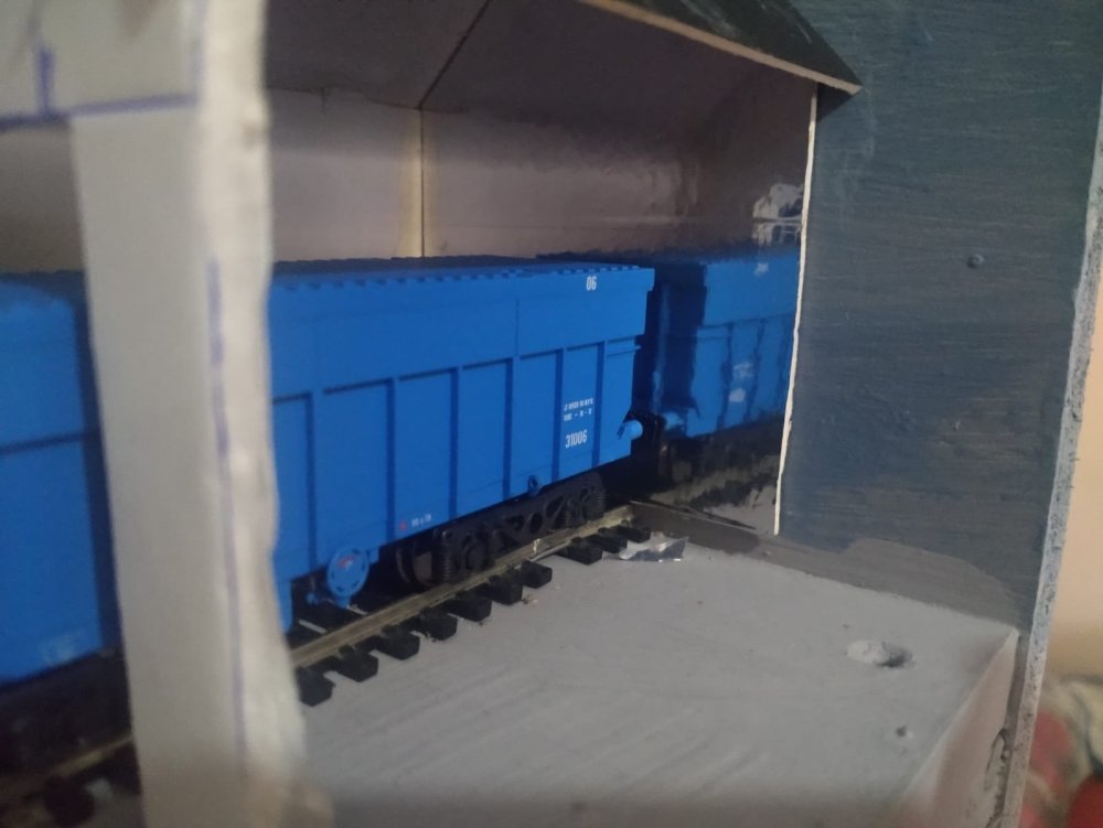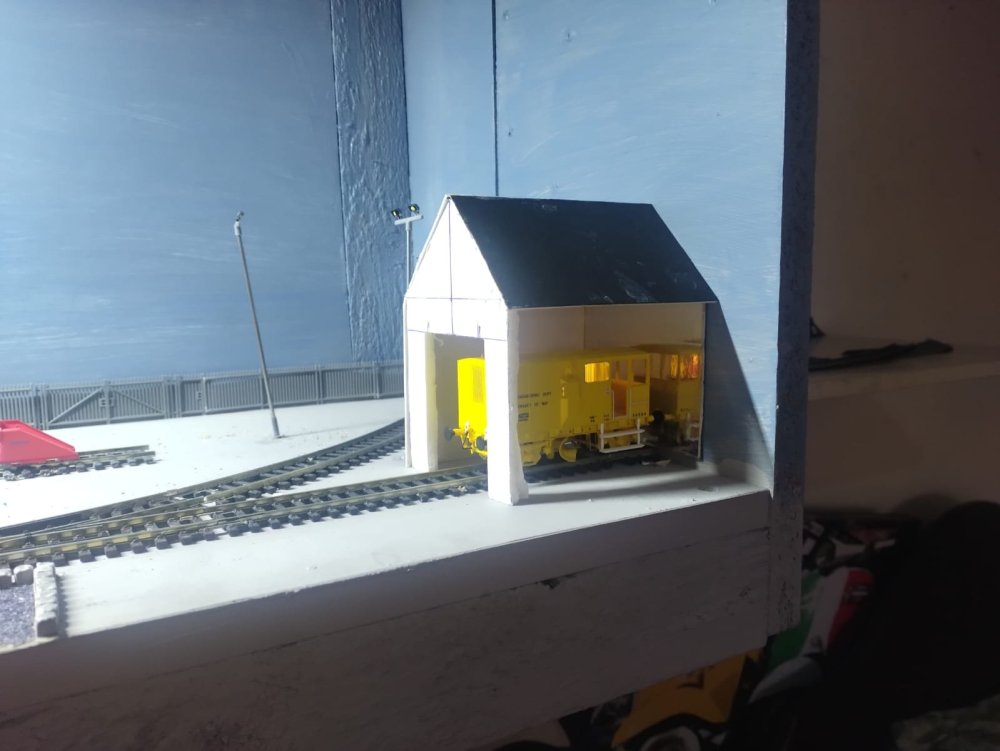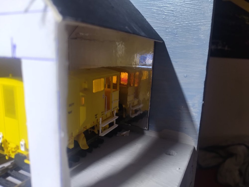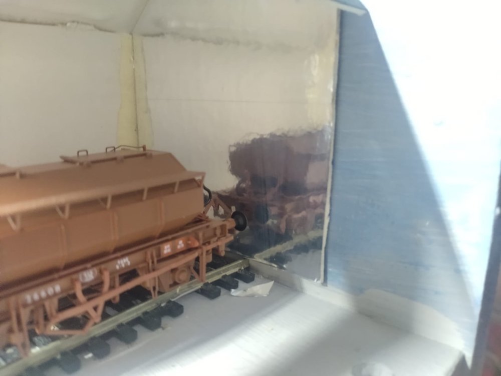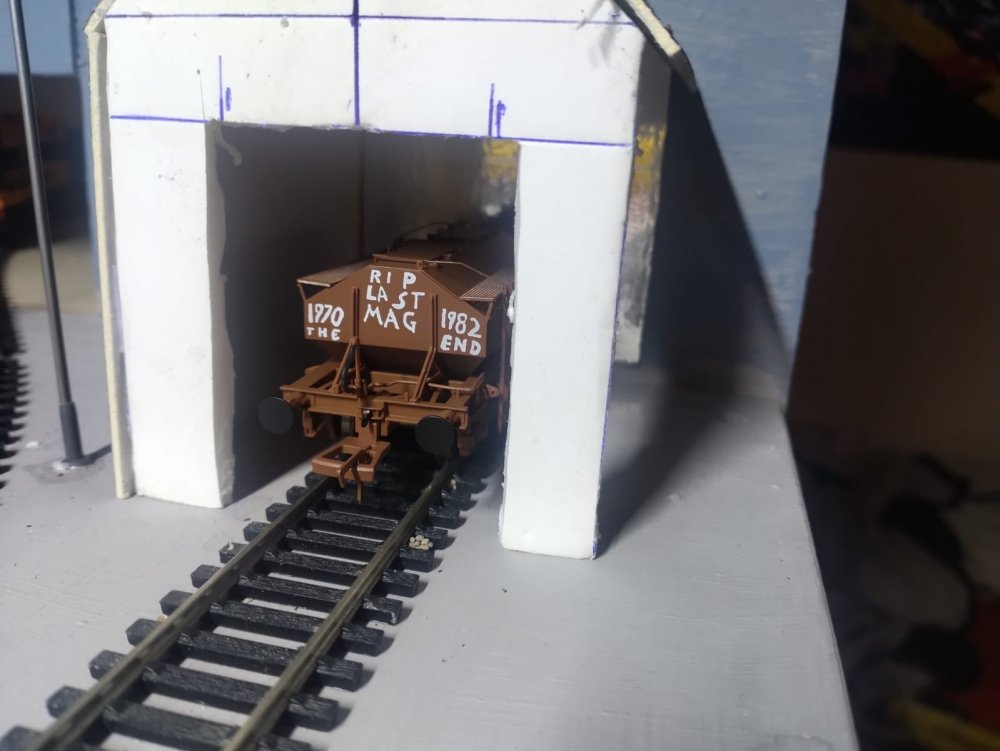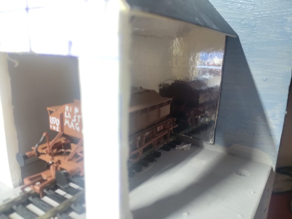 10. coming back from musings earlier in the week i was hit with a eureka moment and headed out for some mounting card and this test structure is the result. The wagon shed was always going to be a low relief affair and i had not originally even intended for the shed to be tracked but it did need to be a bit bigger as the whole idea of having it at all within the constraints of this build is that the shed is a view blocker for the far side exit, I also wanted to build on the half wagon/mirror idea so i got the bright idea of putting it all within a single rendition of the wagon shed. I think i am going to leave it like this with three walls and focus on developing a detailed interior to compliment the idea. This leads to the illusion that the structure is double the size that it actually is, and that there is an additonal piece of rolling stock inside. A pair of mags await decommissioning I really cant justify building another rake right now but i did want to get my hands on the last mag while they are still around, im sure one or two of them ended up in N.Wall before their eventual demise and this limited piece is definitely a nice little show piece to have around.