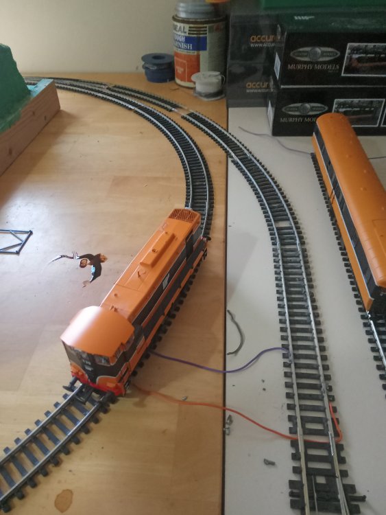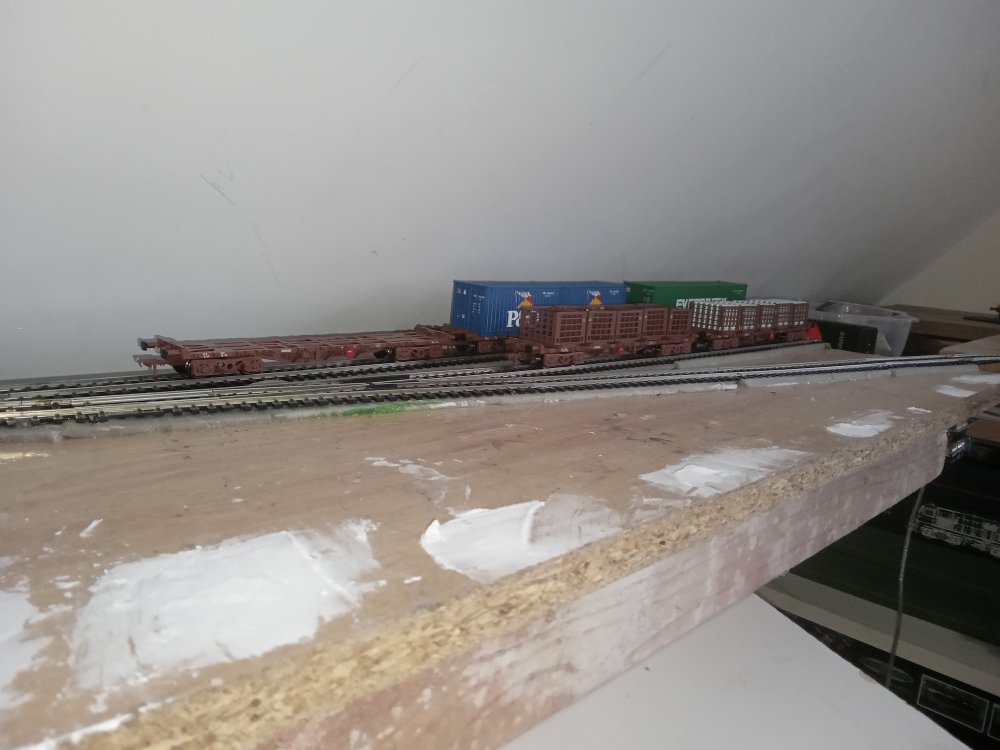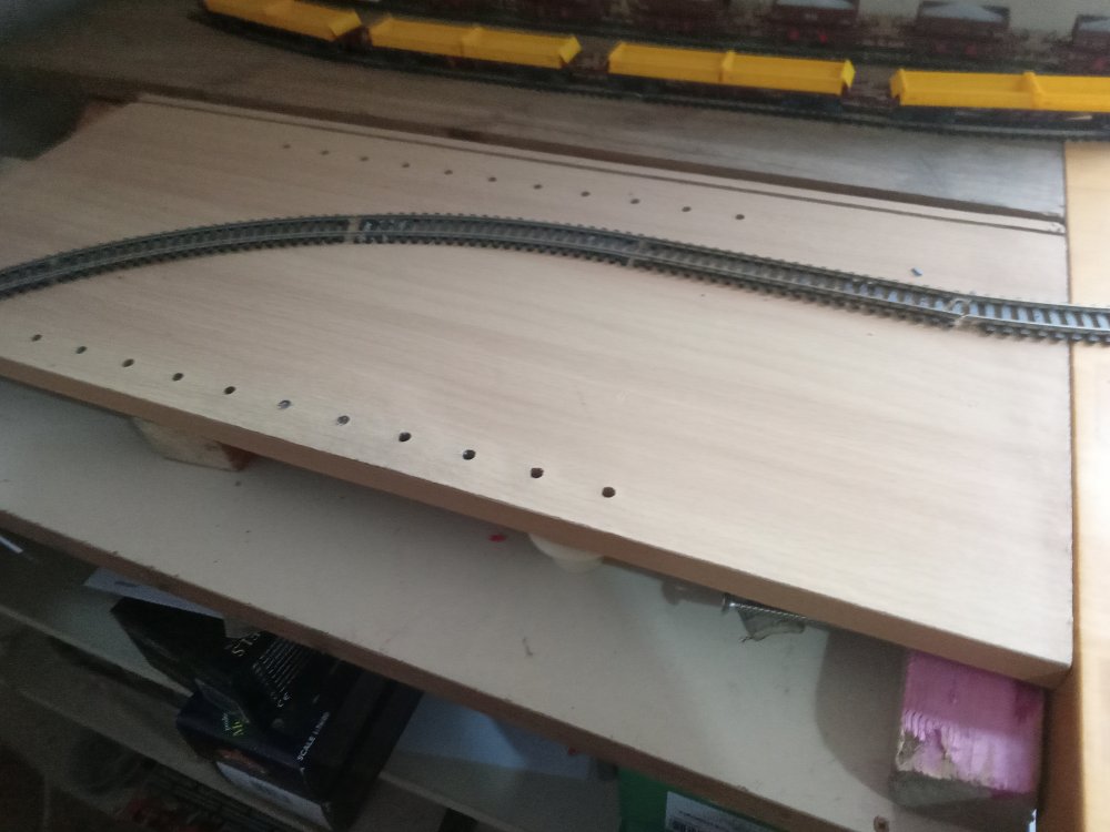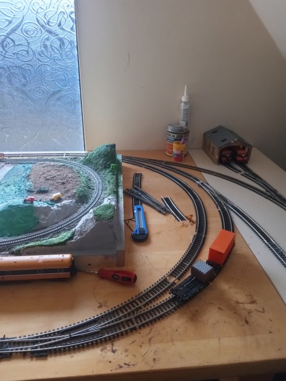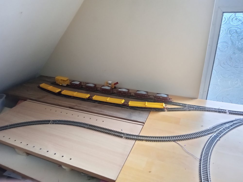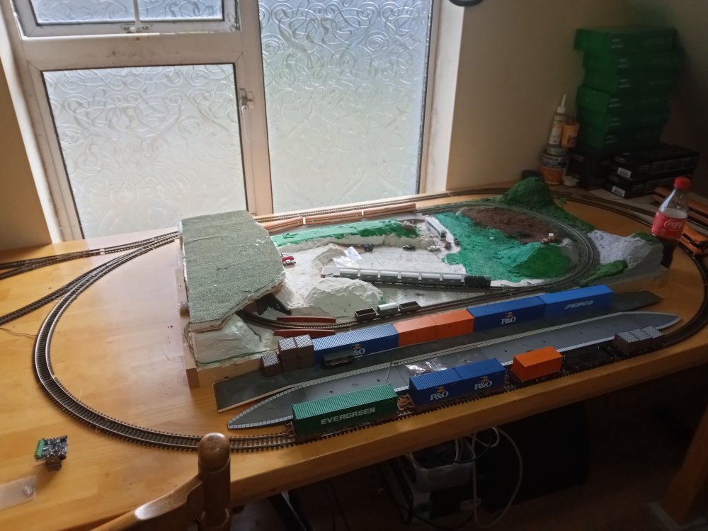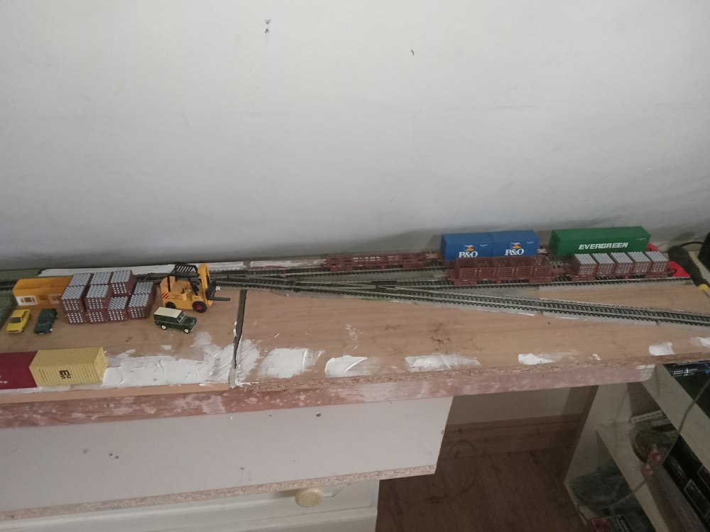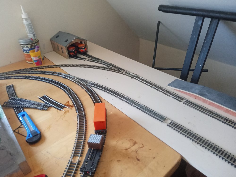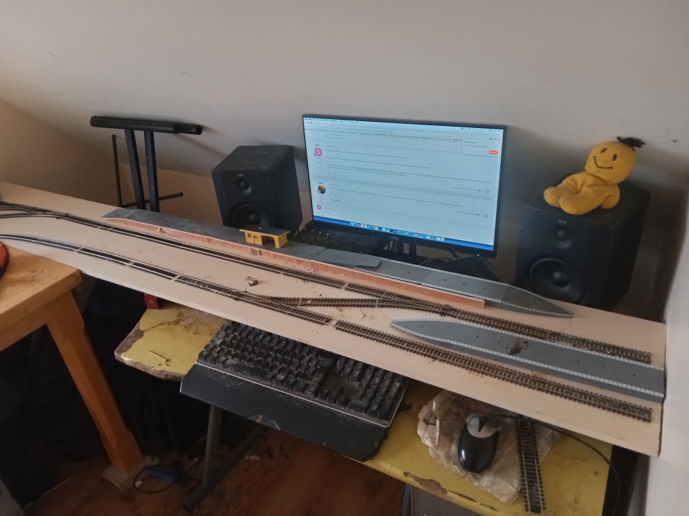 have just been mostly testing things this week and getting the tracks cleaned up as well as learning the ins and outs of CV's but after a brief hiatus i did get some more building done that will shape the rest of the layout and the room. no videos yet as im still getting to grips with all the fun sound features like drive hold and making the notching sound more realistic. After a decent bit of consideration, Particularly the fact that i am still getting to grips with the concepts of compromise, extrapolation and minimalise in relation to model railways coupled with the idea that I would like the trains from the inglenook to have a destination to go to/from and that I kinda need somewhere to run passenger stock to/from with all the nice upcoming releases. This final board might just suit my needs perfectly until I have the confidence to expand it into a large running loop that goes around the whole room( thats a WHILE away though just a pipe dream for now) somehow against the odds i have managed to fit in a small passing siding on the main loop without breaking geometry, its usefulness is a little limited though however and might be better suited to a tight siding on the first radius that i could squeeze a rake of coaches around, time will tell on that one as i have now officially used up all of my track except for a pile of hornby points that will be put nowhere near this layout one thing i actually didnt want to compromise on however was the size of the running loop as overall this would limit the possibilitys of what can and cannot be done. so another country terminus was actually perfect. its also a coy place to station yet another pilot engine. and so the result is that i have actually gone back to the old westport track plan and rebuilt it over this side of the room as it offers several advantages, once a train has loaded up at the inglenook it can be driven here and a few cars can be switched in and out and the train can be sent back to the yard and shunted again in order to reset the game and one can repeat this as many times as they would like in a given running session. since this is the original quayside station again and no run around is available, 121's must run bonnet forward here to and from the quays in order to ensure the layout keeps operating smoothly. the main running loop shall be considered single track mainline and bonnet forward is not allowed during continuous running. the loop itself can accomodate 6 mk2's and a dutch van which would be a prototypical rake, however the only downside is that on my main running loop such a train gets to look as if it is chasing its tail (lol) hence the future plans to expand, I will mostly run prototypical half rakes unless there is a special event running which requires the use of a full rake.. looks a bit awkward with the computer but its actually okay, Im considering running a blue curtain along the back of this board in order to act as a backscene that i can open and close as is needed. One conclusion i have reached during this process is that at this scale I really am into the idea of building super detailed micro layouts rather than vast continuous runs of track, mostly for space/practicality and financial reasons. it can be very difficult to get even the most modest of running loops up and running in oo gauge, the idea of basing a larger layout around smaller modules also really works well for me and my average attention span. To that effect I am considering jacking up the n gauge layout approximately 6 inches so i can put a solid backscene along the front of the running loop and could model another scene along here. it would be a great place to squeeze in a micro "bog road" type layout that would overall actually only be a few feet long.