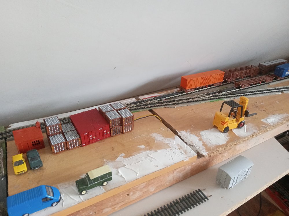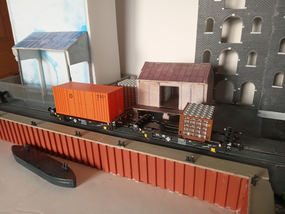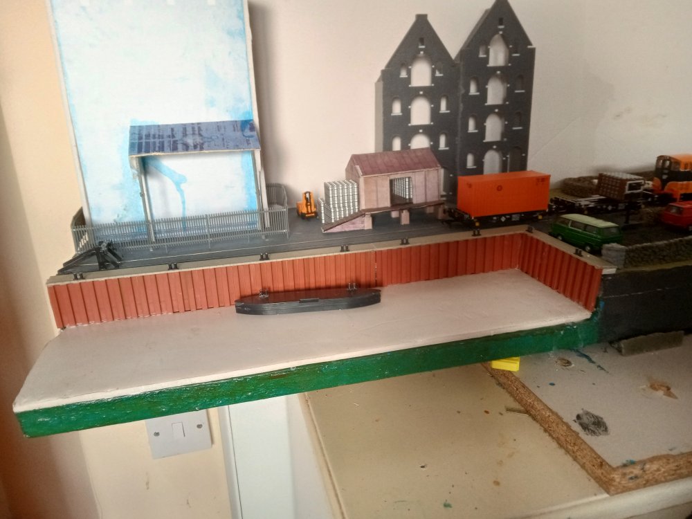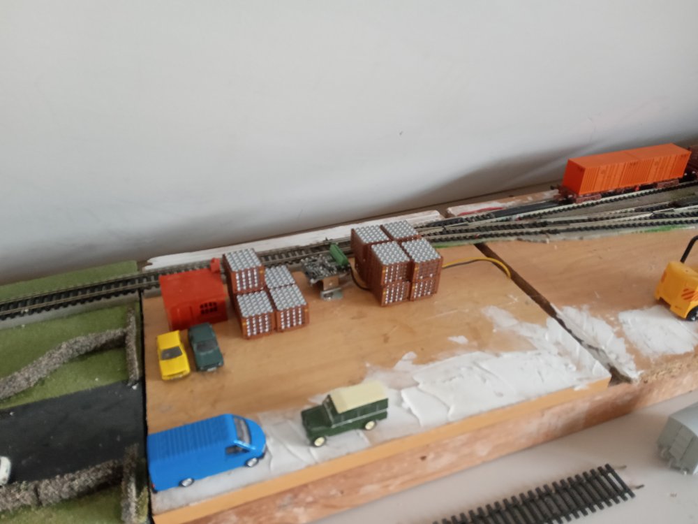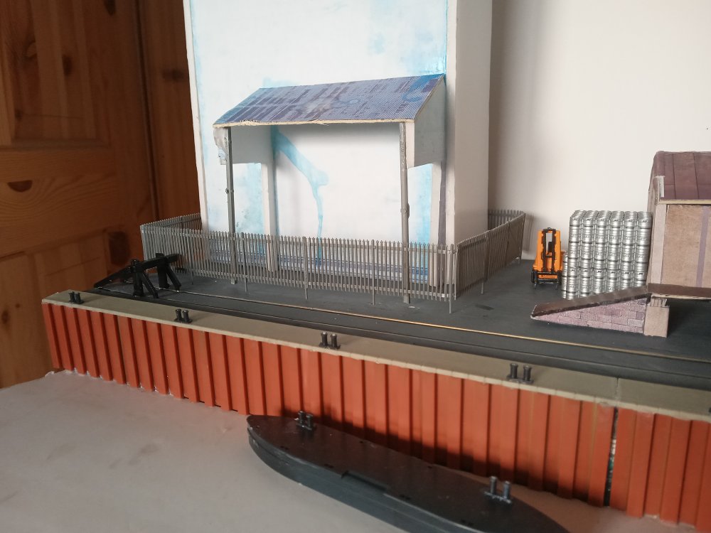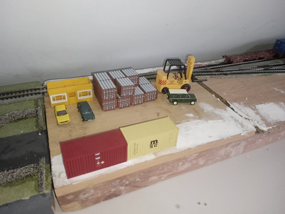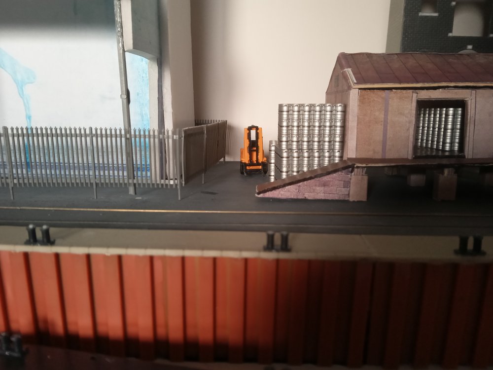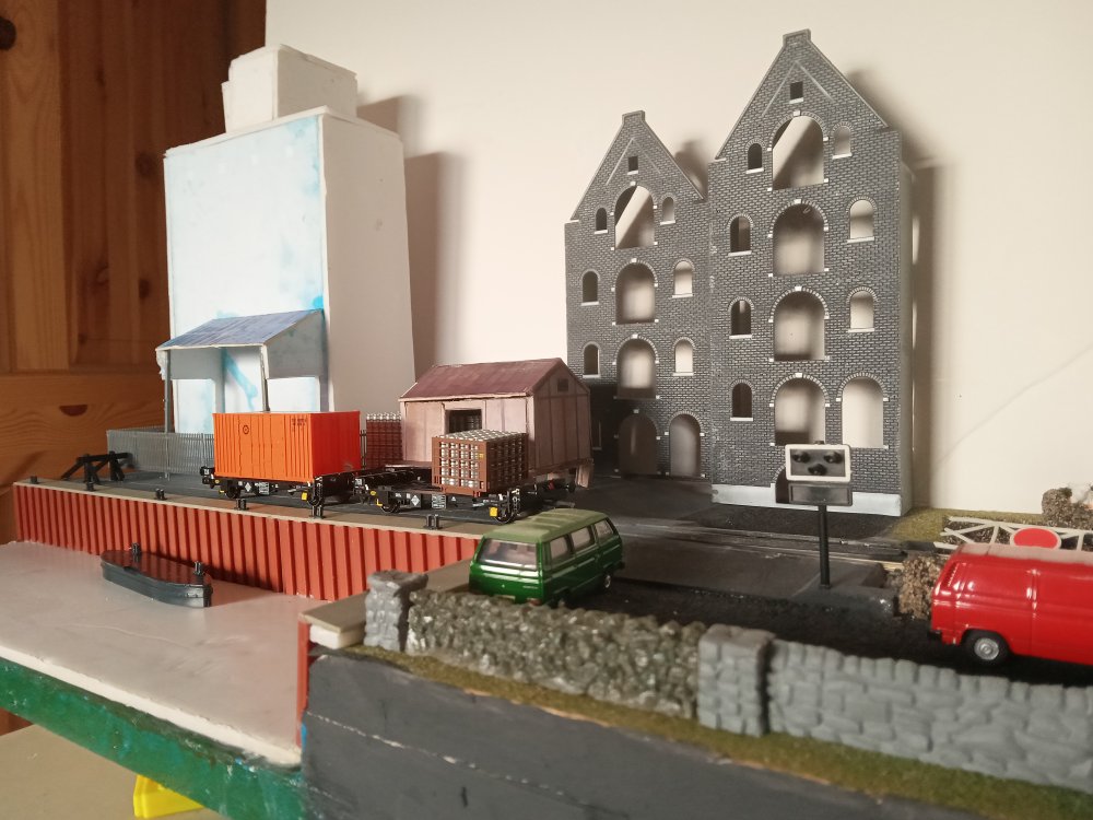 + as we roll into the 90's In an alternate timeline the rail spur has miraculously survived, mainly due to the primary school having being refused planning permission on the proposed site of the old station. With this IR seen opportunities to create a small barrack street style spur on the old station site and the railway survives for a few local businesses who visit the inglenook yard when they wish to convey goods over longer distances.This in particular includes many of the local publicans who still receive their kegs via rail..... the old station still had to be demolished to make way for this yard and thats where the inglenook sits now. the two warehouses in the background are now apartments. the mill has long closed off and has been fenced away to rot. a few customers particularly near to the quay are lucky enough to be able to take deliveries from the quay directly. only served by the sundries store. Typical deliveries to the quay will be a cage of kegs and a sundry container to be manually unloaded however occasionally these deliveries will be bound for a boat which will take them off to some of the local islands. Atmospheric shot, kega are the only suitable load i have at the moment for here but ill change that soon enough. modded the silo a bit to look more prototypical, not in a rush to finish it off really as i dont posess the skill to finish it to a standard that i would like just yet. All in good time. Harbour wall was a kit, meaning i had to cover up my nice waterwork, will be worth it to redo it in the longer term Back at the yard everything seems to be functioning well, I was however quite annoyed at having to mount one of the point motors on the top of the baseboard. That being said, I did a pretty good job at hiding it within a pair of containers. and i was able to work out how to handle the other three that ive got for the hard to reach points on the running loop. So thats it for now, as things are up and running im sure you can expect some running videos soon enough, and an update of what to expect from the mystery board, as plans always change in that regard!