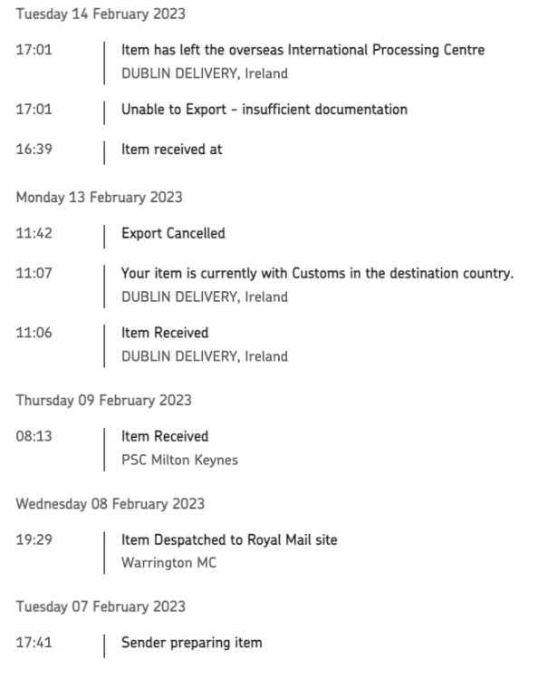 Check the tracking on royal mail; mine showed up like this whilst on the royal mail site it shows them up as having being refused by customs. and returned the anpost tracking seems to stick up a generic message like this every time the item gets scanned within the country that doesnt actually tell the customer what is going on at all. one of the packages i was sent on feb 7th is now showing up as the item is no longer with anpost whilst on the royal mail tracking it shows "your item is now leaving the uk." despite it being back within the uk postal system somewhere. hattons recieved back my other package and refunded that one, this one has been in limbo since feb 16th but the tracking pattern was the exact same so it should be back with them soon..... at the same time i reordered on dhl and had the stuff within 48 hours which kinda made the outrageous price(for me at least) a little bit worth it. all customs bullshit was taken care of before the item even landed in Ireland and it was out for delivery on the next van after it landed.