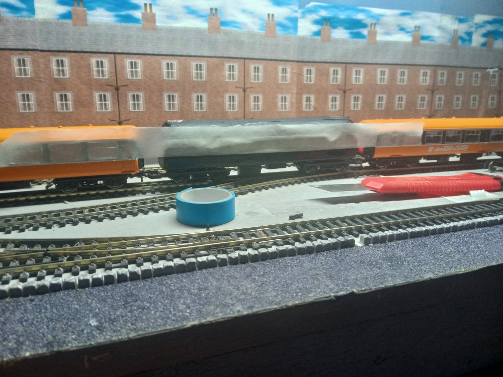 experimenting with the masking yesterday an today, this may not work out but so far is actually looking straight so i have some faith in the idea,I guess ill know in a few more hours haha. Parking a coach at either end I am starting the mask on one of the coaches until i have the tape lined up perfectly with the livery stripes and then i am going and doing the exact same thing on the other coach but ignoring the van until i have either side perfectly leaving a little bit of slack in the tape. when im happy with the alignment on the coaches i wheel them apart and let the tape naturally tighten up until all slack is gone and then I am gently pressing the tape into place, never seems to be straight the first time but its usually quiet close and at this stage if i need to adjust it im lifting the tape off the coach and reapplying it along the livery line which seems to begin to iron out all of the kinks.