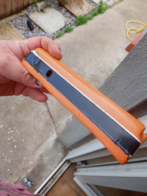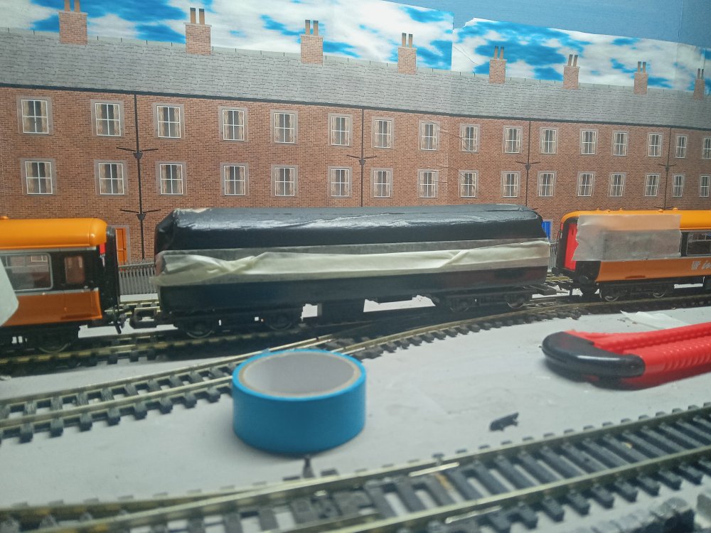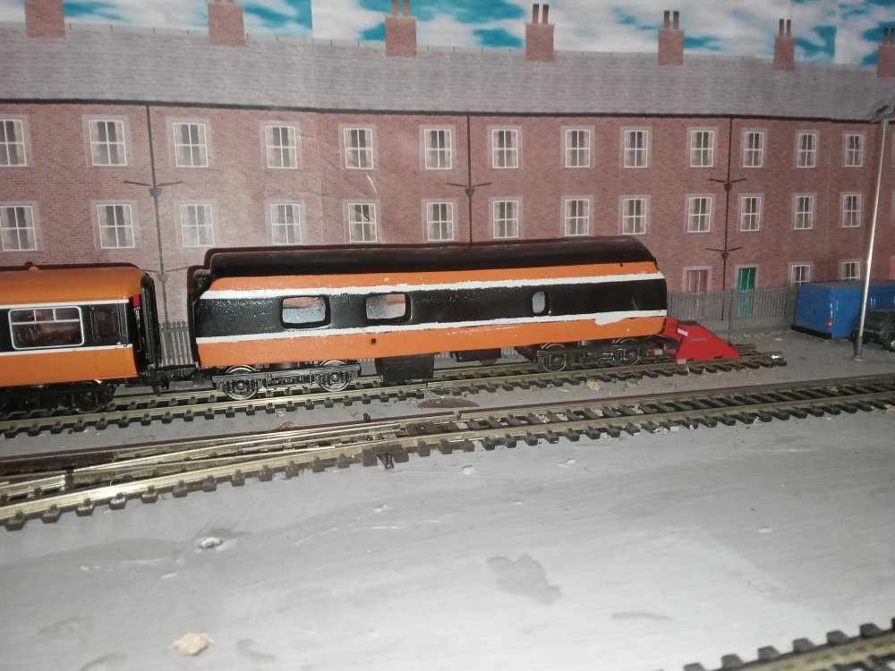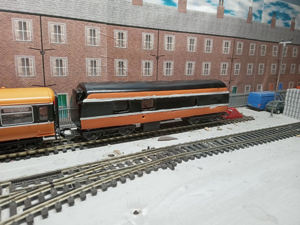 the white paint was still soft and lifty this morning, whilst the black roof and ends presented no issues whatsoever, reminding me why i swore not to buy dealz paint ever again. masked off again and brushed on an enamel which dried properly this time, once that dried i remasked and did another black coat with the aim of sharpening the lines which seemed to work, sadly could not do the same with the orange layer which would have tidied things right up as i ran out of orange paint, ill get back to that in a few days though when i get to the shop. kinda happy with it now except for the last orange paint coat but im still gonna be on the look out for something to use as a suitable gangway and handrails as well as a decal kit and a source of egv grilles. only built this yoke out of the OCD factor of needing the right egv to go with the particular set of coaches im running. when the IRM ones arrive im gonna need to build a second one. so gonna start planning that soon also.