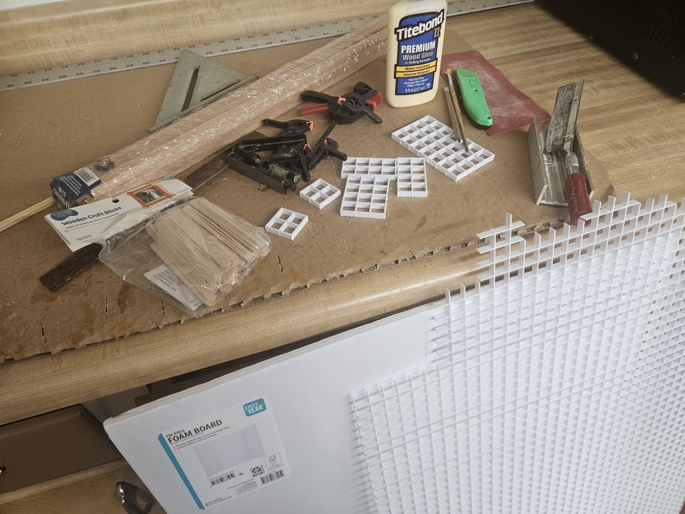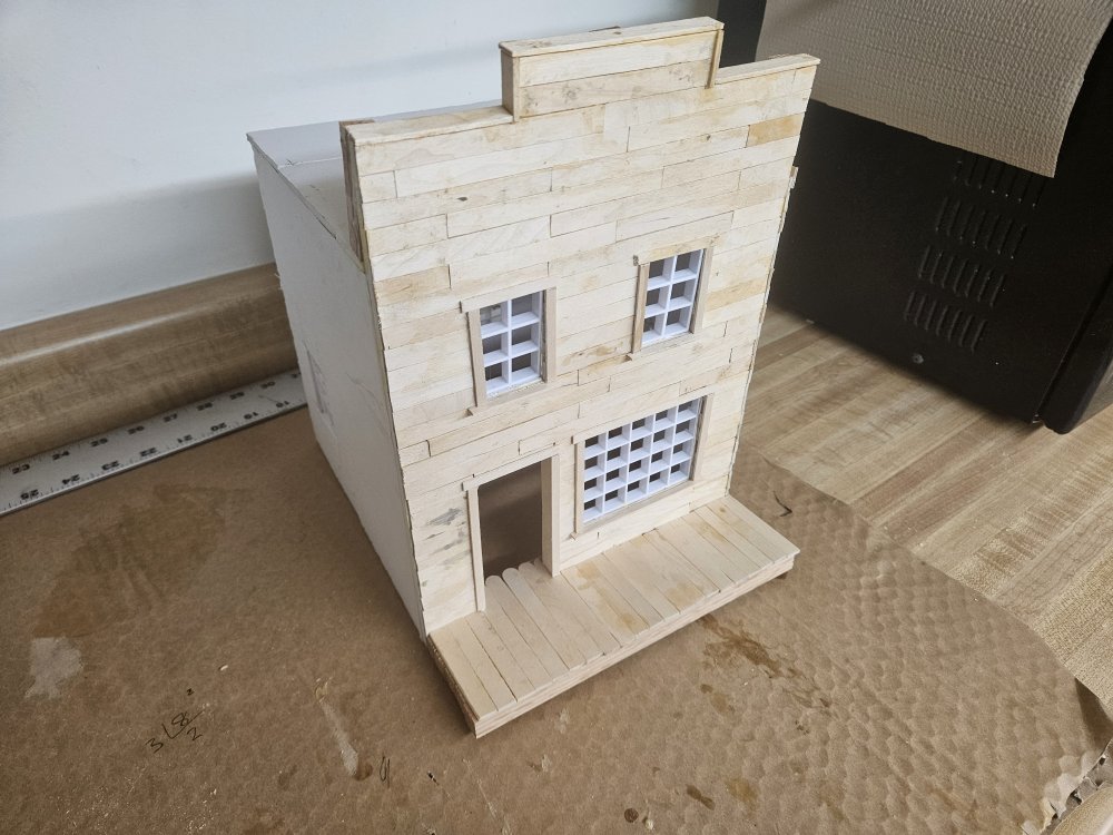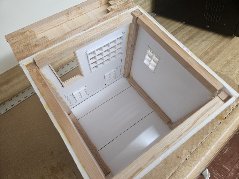 I have been constructing few buildings for the railway. The windows are cut from plastic screen for fluorescent light fixtures.l, a tio I found on YouTube.