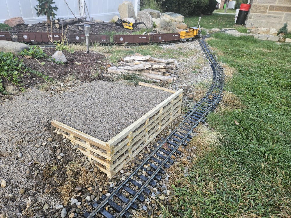 268 on a coal extra on the Tincup branch. The 268 is an Aristocraft model which has been fitted with a Piko R/C unit and rechargeable battery. The truck dump was construed using leftover pressure treated lumber which was cut down on a friend's table saw.
