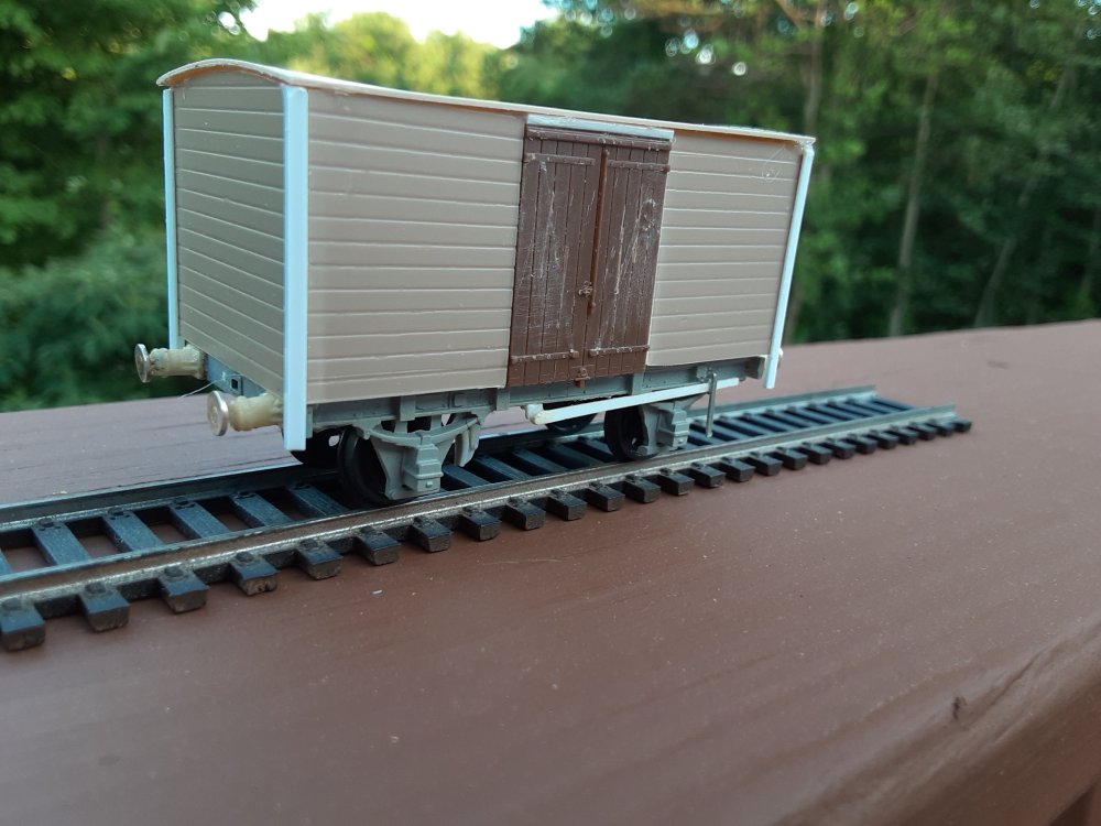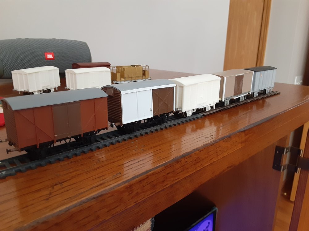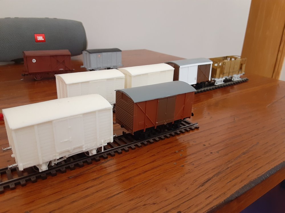 5. With four Crossley engined A class and a grey 121 added to the roster recently more grey loose coupled goods wagons were needed for sixties operation sessions. Here three Provincial Wagons GN 12 ton vans, a Parkside 12 ton van, a Parkside palvan kitbash and a Studio Scale Models 30 ton brake van await the paint shop.