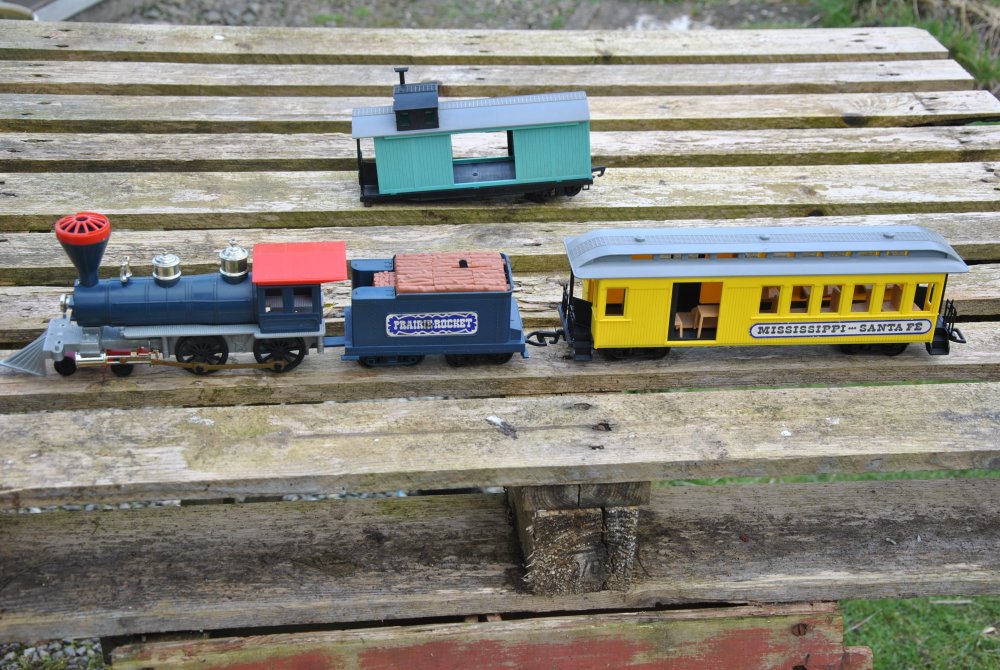 Well, I got the rest of it yesterday and was able to remove a bogie and transfer it to the tender. My assumption that the carriage bogies would be identical was wrong - although they would fit, the connector arms are longer there. It would work, but be a little unsightly. The redundant arm could always be cut off on the final bogie on the train, of course, so we can use either to refit the caboose. The loco action was binding in a few places, but it's reasonably free now - it would have been an issue with the light weight and the tender-driven layout. The pony truck was not retained, so it fee off whenever the loco was lifted - it has a wire clip holding the pivot-end in place now. It's all rather fragile, partly because of the age, I suspect - and I have little faith in it surviving long in service. We shall see... This is all largely about indoctrinating his four-year-old lad and infecting him with the bug.
