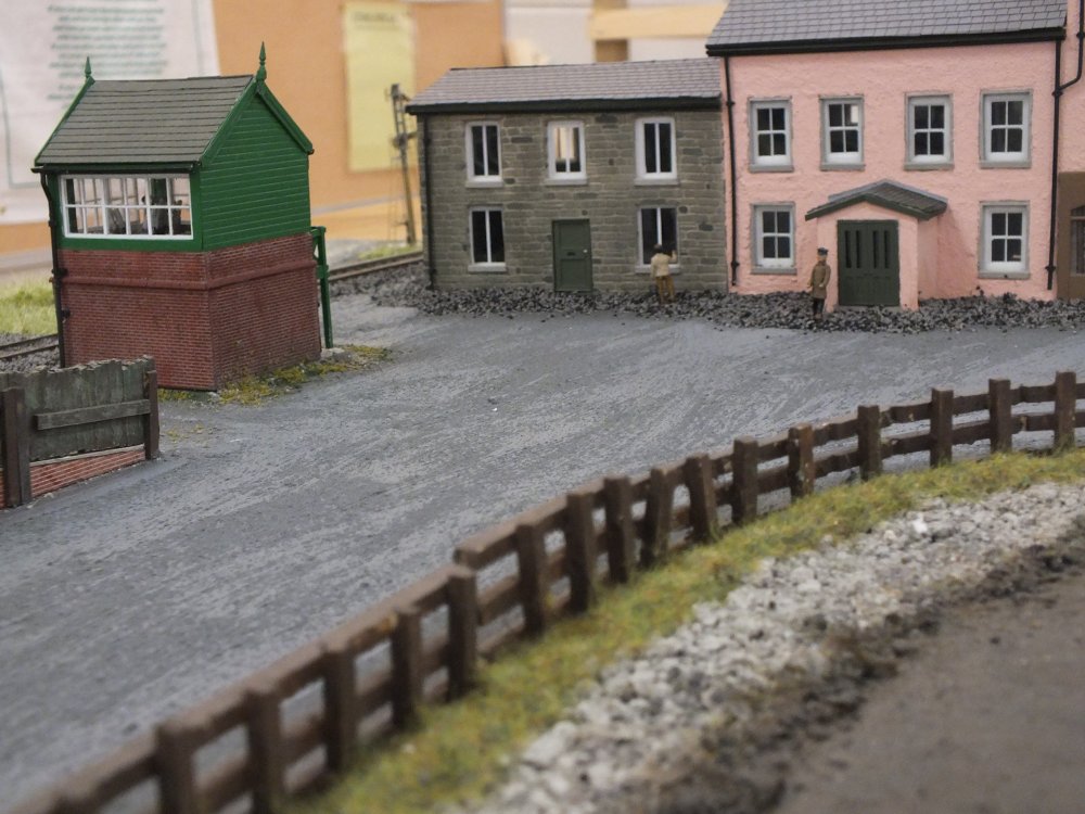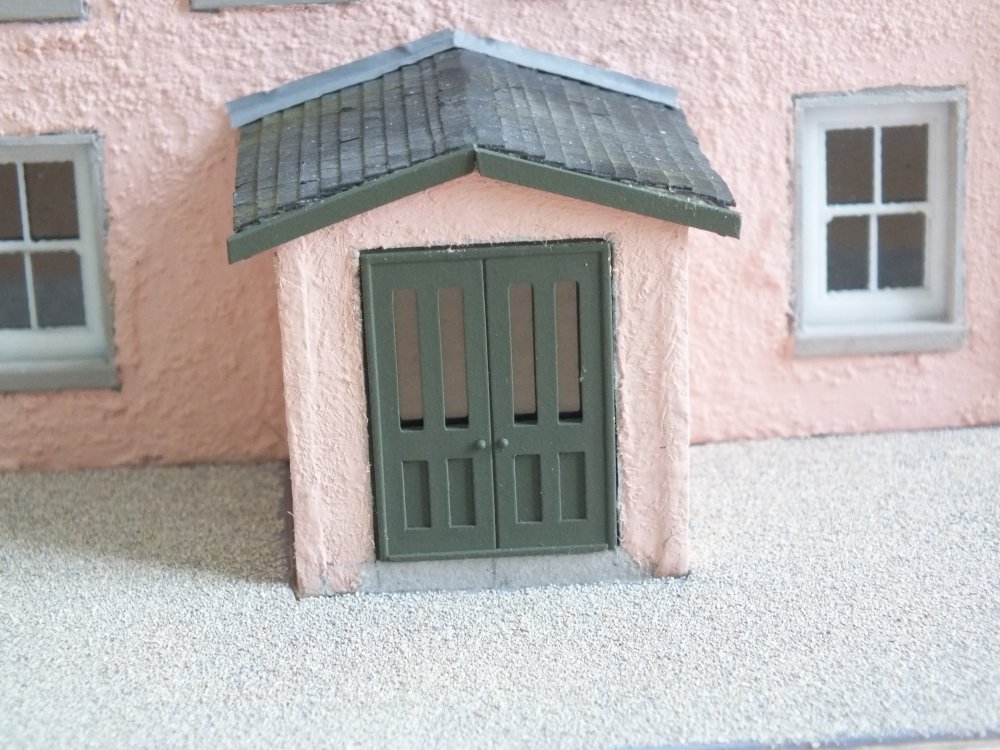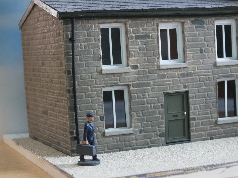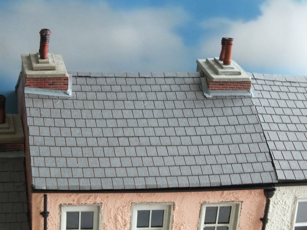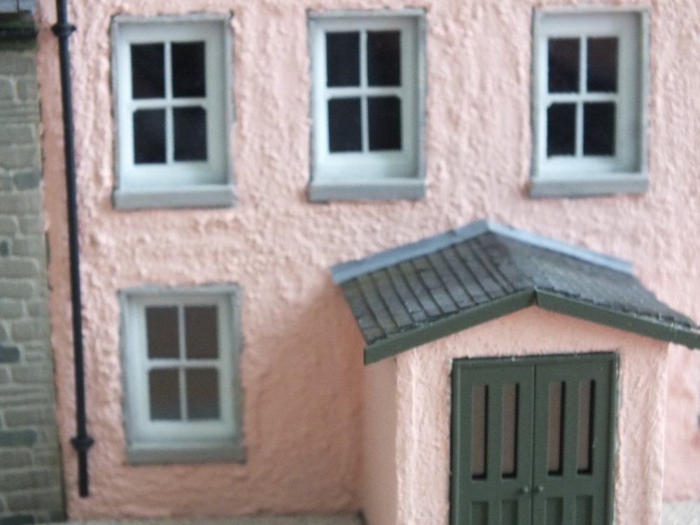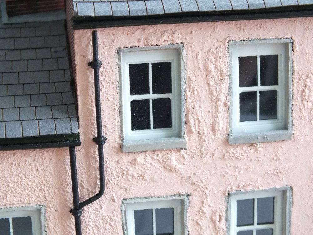 The pink and white buildings are card surface coated with shellac first. Then when dry I laid the wall face up. I then painted them with 1) Pink chalk effect pink paint then while wet sprinkled with chinchilla dust, (sieved through a nylon pop sock-not mine!)most stays on the paint and is left to dry overnight. When dry shake off stand building upright and any dust that has not stuck will obviously drop off. You can go over any "bald" area by sprinkling sieved chinchilla dust on the patches and paint over the dust with the pink paint. I was worried that the effect might be ruined by doing this but it works. The cream/white is Sandtex paint applied as above. Gordon Gravett uses chinchilla dust for ground surfaces but I found it very effective for buildings Hope this helps-anything else you need to know please ask. I believe the effect is pebble dashing Thanks for kind words
