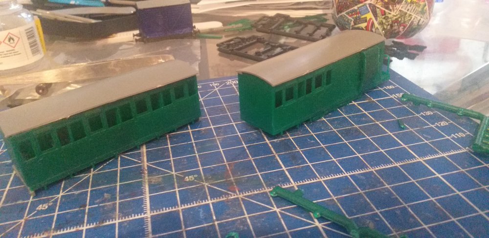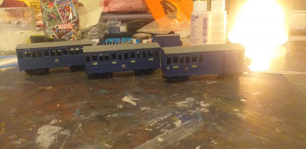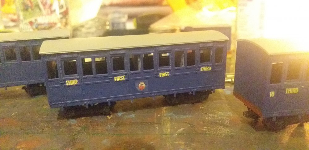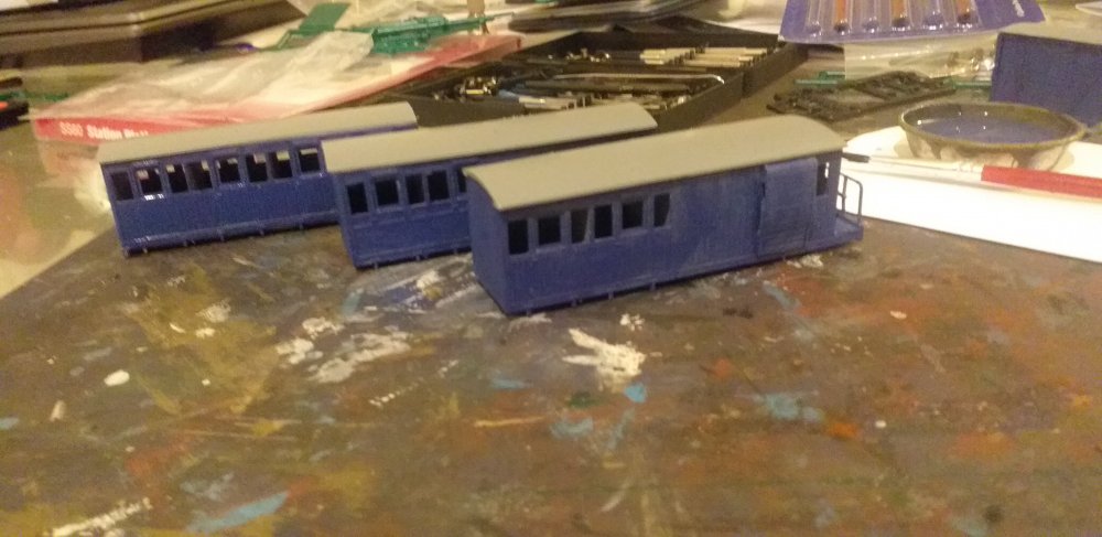 A venture into a smaller gauge and a new topic. Inspired by the work of two of my friends experiements in narrow gauge gauge gave me an itch that needed a bit of scratching and plans for a small micro layout for the other set of boards that Backwood used started to be lazily sketched out while preparing for a house move. While the boards await track and for a finalised plan, the railway that was to be the subject of the still unnamed layout was an easily decision and chance for a little more fun prototype. Pints to anyone who knows their stories... The first major train was the line's top link train, ran for tourists during the summer, bringing them from the port up into the mountains, dropping them off at beauty spots for picnicing and hiking, earning the nickname of The Picnic. The rake just awaiting couplings and windows. Oh and a loco to haul them!