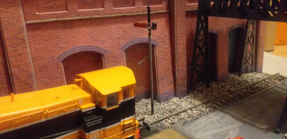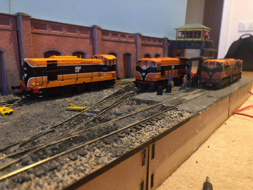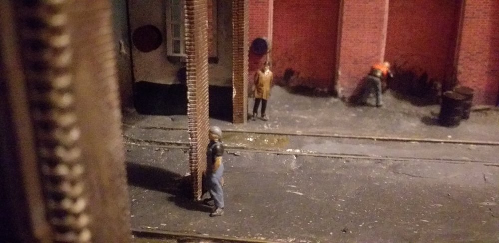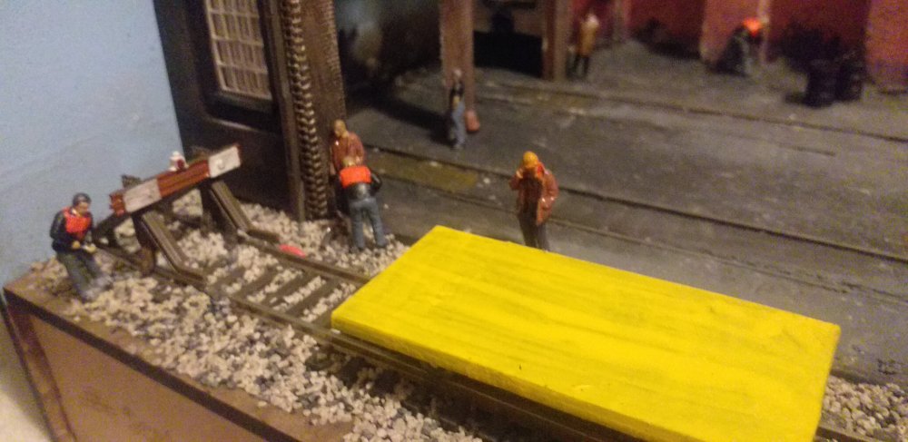 Having moved houses, Backwood was packed away until recently some free time was found to add some finishing touches to the layout. The exit road gained a signal controlling movements to the world beyond the yard. Hand Point levers were painted up and added to the S&C around the yard, the fuel point and yard was weathered and details add, including this shunter having just finished refueling 071. Touches like the human touch add an extra dimension to layouts, and I love setting up small scenes like a fitter taking a break under the watchful eye of the foreman or this track gang working on the headshunt's buffer stop after the shunt was reballasted, including the TSC on the phone over line blockades.