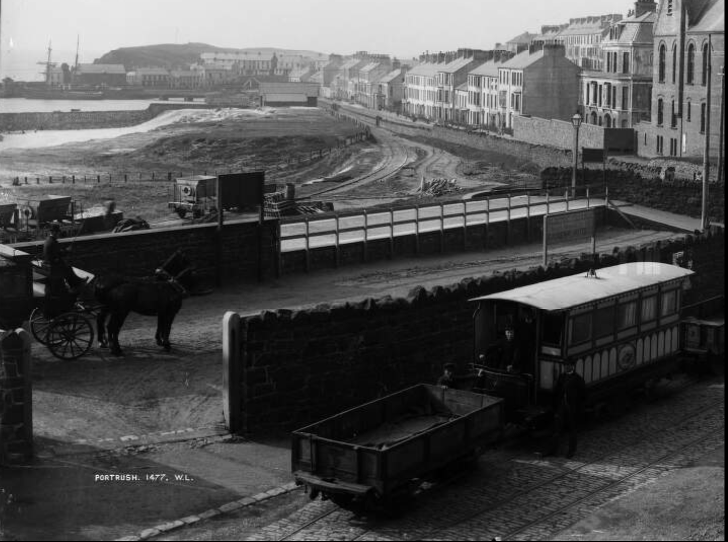 Galteemore Posted 4 hours ago Posted 4 hours ago 12 minutes ago, Flying Snail said: Another interesting shot from Portrush by Robert French - the tram in the foreground, but behind it are some tipping wagons with what I think is an open wagon a lower level: Original Lawrence Collection picture here: https://catalogue.nli.ie/Record/vtls000058791 The tipping wagons are on the 5’3” harbour branch - the track of this can still be traced and the bridge in the background still exists. In later years the branch was used for carriage storage. It could take a few WT tanks some significant effort to lift long rakes off that steep and curved branch 1 1