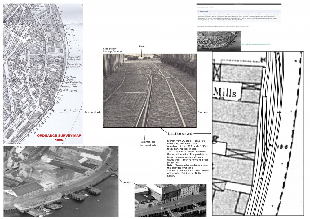 Chris_w Posted July 7, 2021 Posted July 7, 2021 Thanks for the replies. Unfortunately, there’s nothing to say where that mixed gauge phot is actually located. Looking at the photo in question, the following observations: - it’s facing north with the river bending to the left - the dual gauge track always had the ‘common’ rail on the landward side - the building on the left is on the landward side and some of it’s features seem to match where I have indicated with arrows - it can’t be where the previous person indicated between warehouses and transit shed - not enough tracks and wrong direction - there are very few locations where dual gauge track does not exist My drawings show (early 1960s): - 1 broad gauge track parallel with the dual gauge track leading up to the wagon turntable on the bridge - continuation of this line beyond the bridge has a short section of 4 rail dual gauge track which stops at the fence boundary - another track in the vicinity is narrow gauge (see photo looking back at Foyle Road station with the BCNR / LMS / NCC / UTA good depot in front of it). Note: I haven’t plotted that one yet, because I think it was gone by the 1960s.