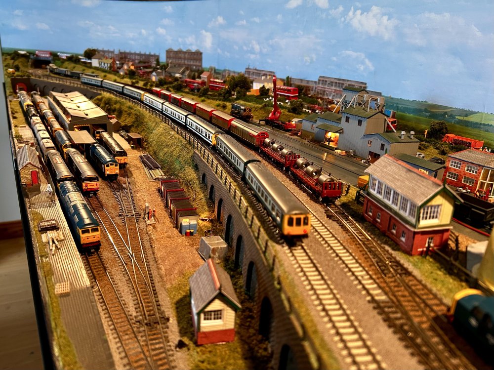 ttc0169 Posted January 28, 2023 Author Posted January 28, 2023 Having been out of commission for a few months,it was back to some BR blue and grey action this afternoon, I had a custom built steel frame constructed that allows the layout to be rotated and dropped down and moved with ease through the room door, Here are a few photos from operations today. 8 1