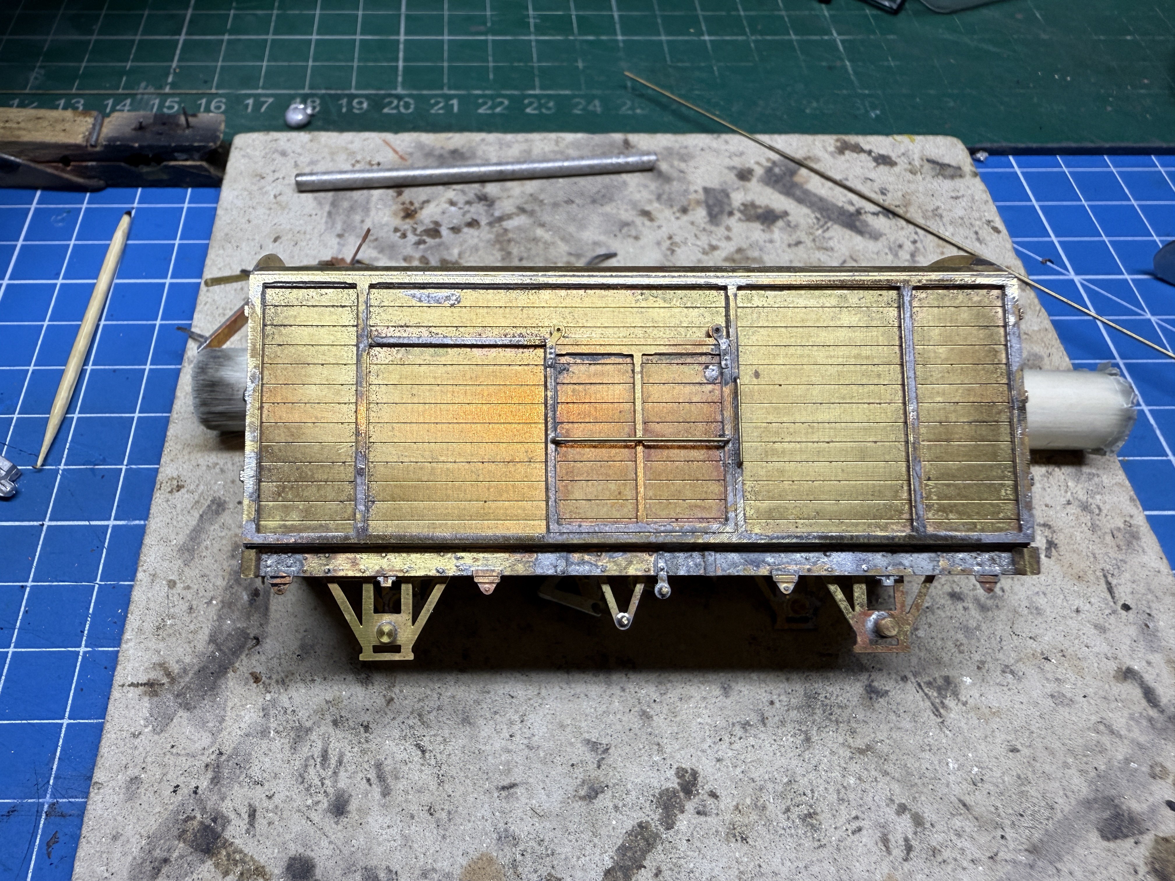 Si2020 Posted June 8, 2024 Author Posted June 8, 2024 Progressing along with the 30T L&YR van. Body has been soldered together and test fitted on the chassis. The door hinges were fitted next 5